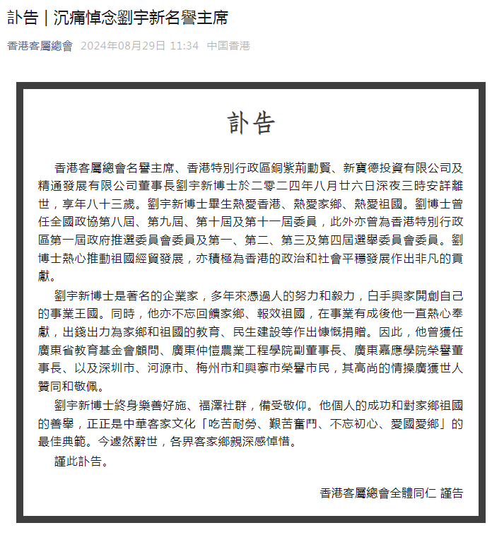 香港客属总会发出讣告称,刘宇新博士终身乐善好施、福泽社群,备受敬仰。他个人的成功和对家乡祖国的善举,正正是中华客家文化“吃苦耐劳、艰苦奋斗、不忘初心、爱国爱乡”的最佳典范。今遽然辞世,各界客家乡亲深感悼惜。