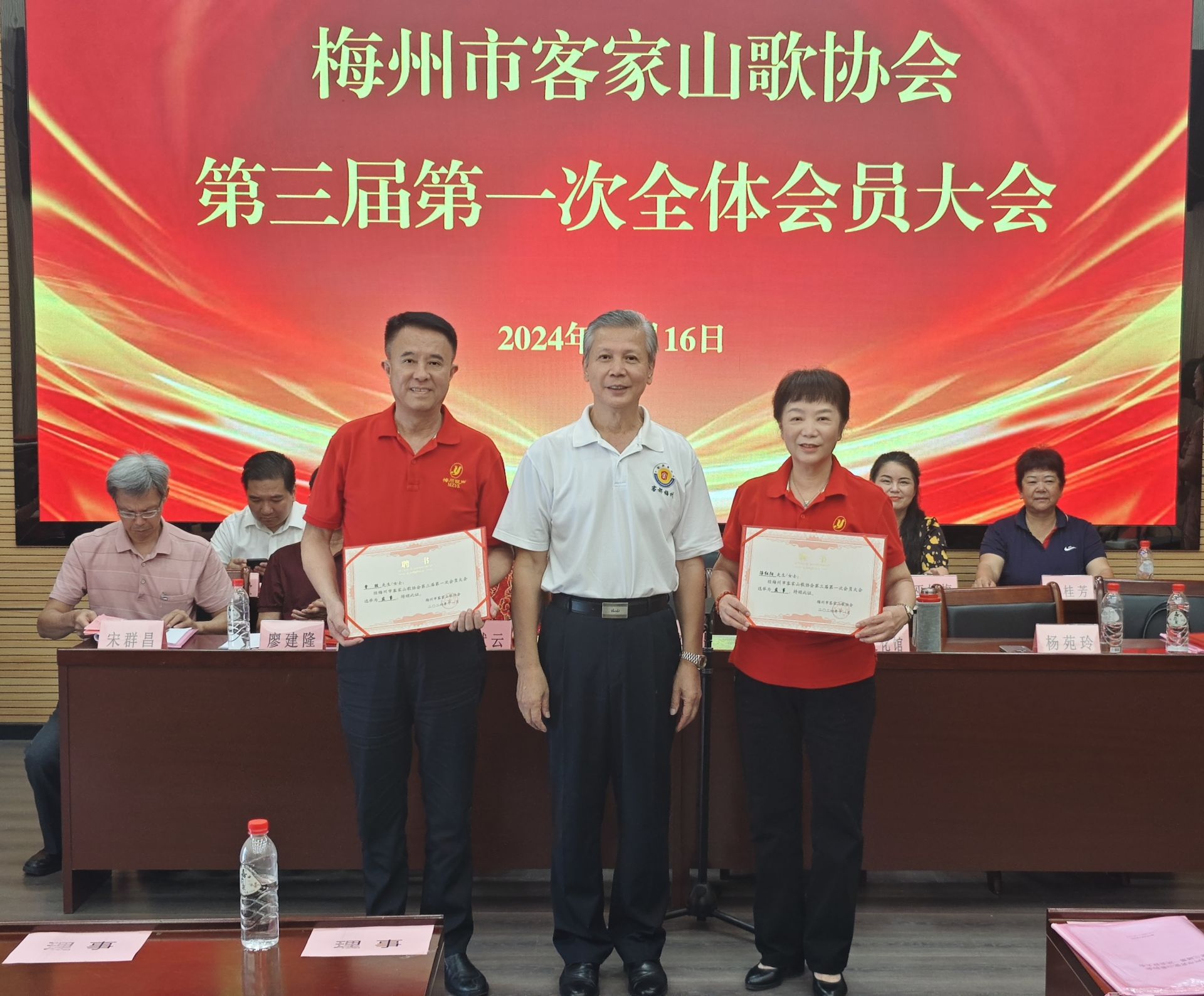 今天上午,梅州市客家山歌协会第三届第一次全体会员大会在市文化馆召开。大会选举产生新一届理事会和监事成员,赵文有连任会长。梅州市文化馆馆长谢静辉到场祝贺。