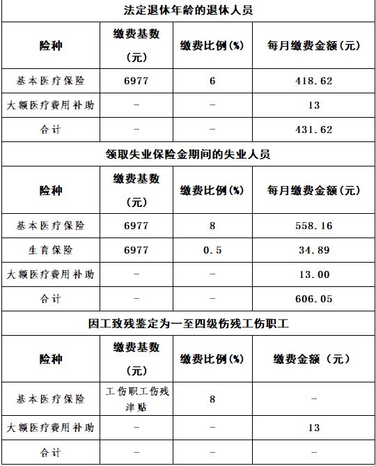 (五)达到法定退休年龄人员(含一级至四级伤残工伤职工):缴费基数为本市上上年度全口径城镇单位就业人员月平均工资,即6977元,缴费费率为6%。