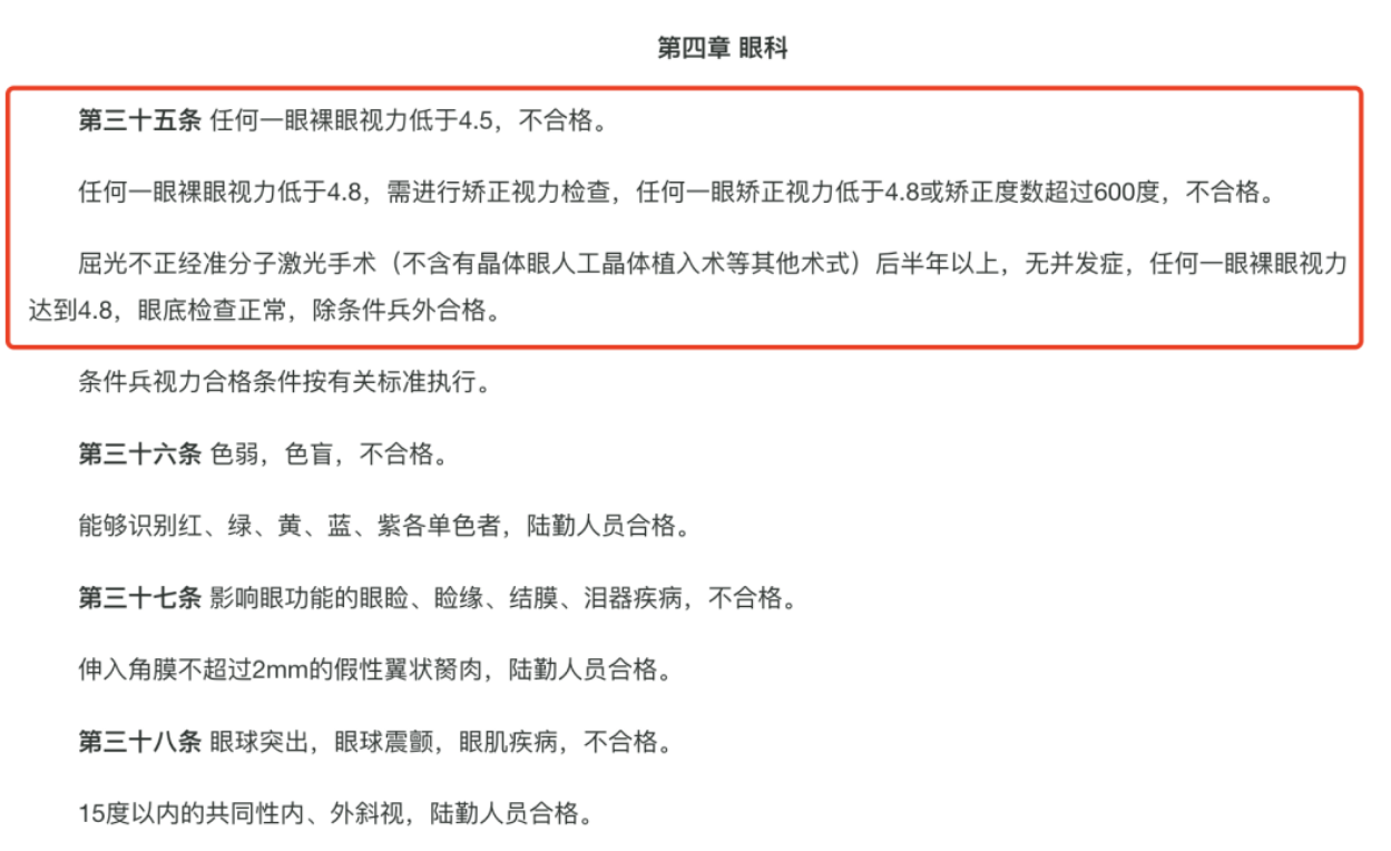 根据《应征公民体格检查标准》摘要显示,2025年征兵视力要求如下:任何一眼裸眼视力低于4.5,不合格;任何一眼裸眼视力低于4.8,需进行矫正视力检查,任何一眼矫正视力低于4.8或矫正度数超过600度,不合格;屈光不正通过准分子激光手术(不含有晶体眼人工晶体植入术等其他术式)后半年以上,无并发症,任何一眼裸眼视力达到4.8,眼底检查正常,除条件兵外合格;条件兵视力合格条件按有关标准执行。因此,视力有问题的考生需及时进行角膜屈光手术,以提升军检通过率。