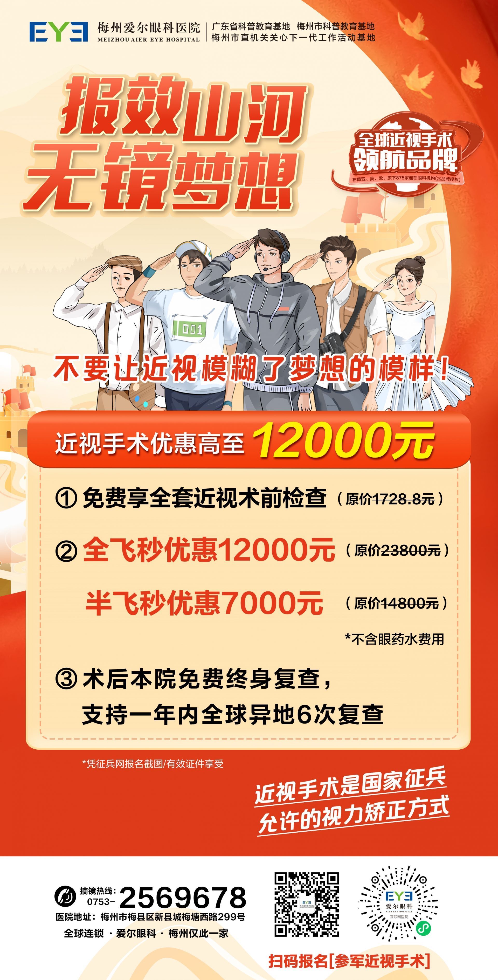 梅州爱尔眼科提醒您:应征青年需特别注意,近视手术并非随时可做,需预留充足的时间到院完成术前检查,切勿因时间预留不足耽误应征入伍。此外,根据国家征兵体检规定,进行近视激光手术的应征者在体检时须提供手术证明、手术费用发票、详细的术前检查单以及术后复查记录。因此,各位有志青年在决定进行近视手术时,应提前与医院沟通,以备体检之需。