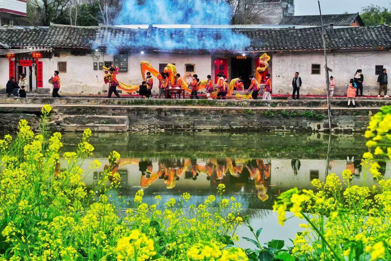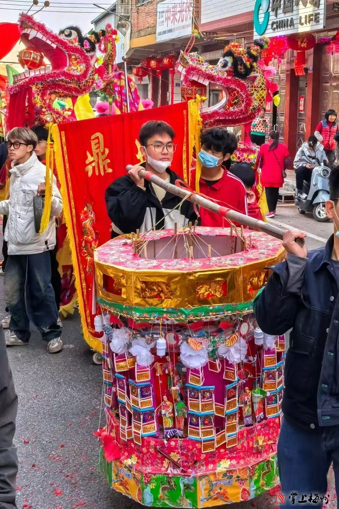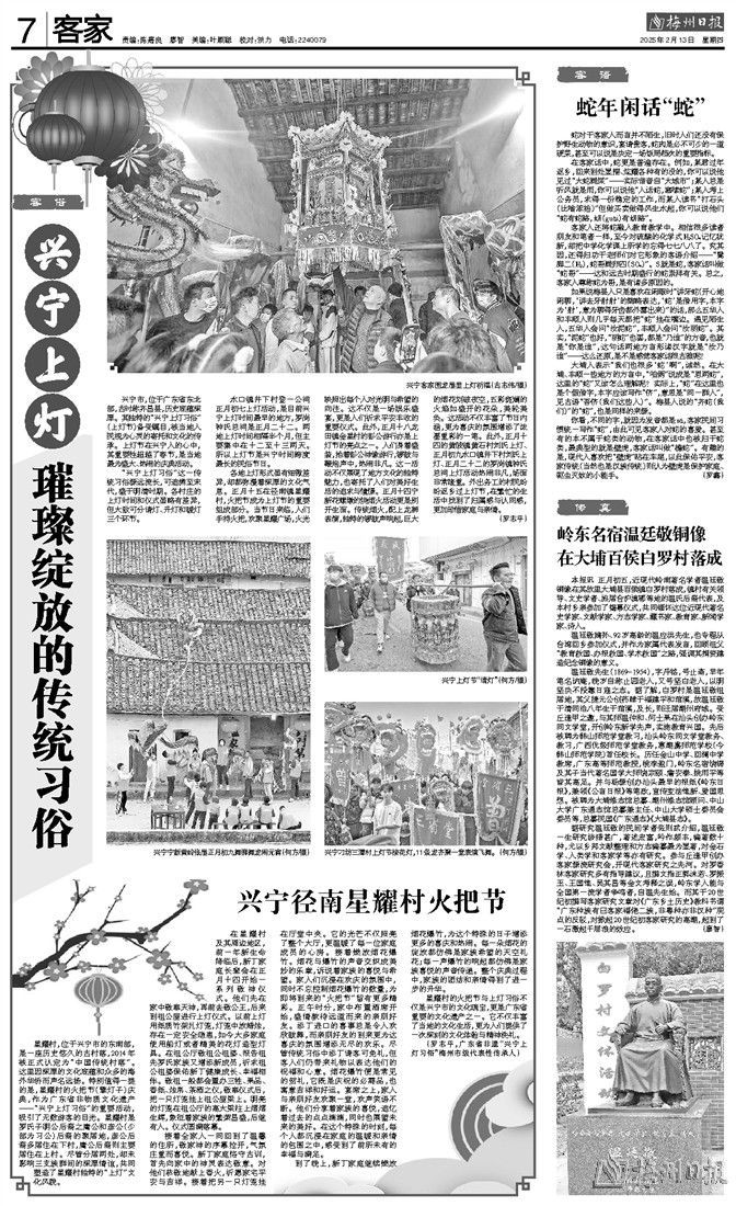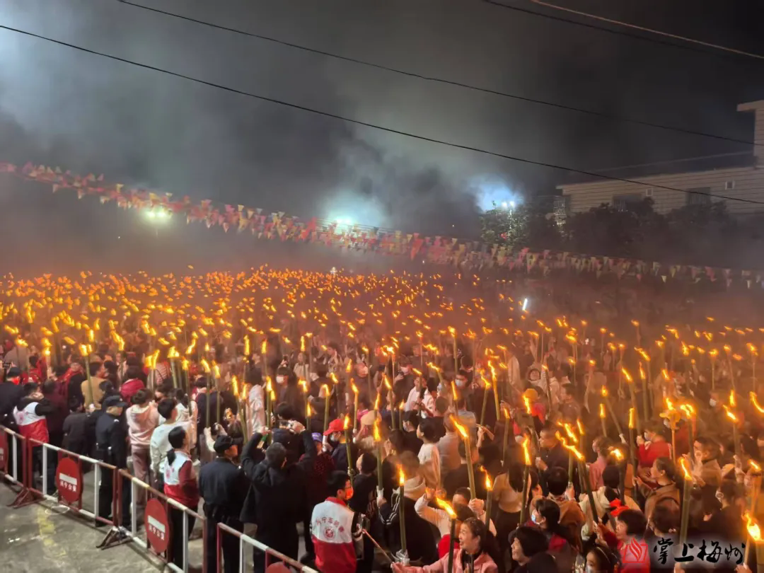 各地上灯形式虽有细微差异,却都弥漫着深厚的文化气息。正月十五在径南镇星耀村,火把节成为上灯节的重要组成部分。当节日来临,人们手持火把,欢聚星耀广场,火光映照出每个人对光明与希望的向往。这不仅是一场娱乐盛宴,更是人们祈求平安丰收的重要仪式。此外,正月十八龙田镇金星村的彭公游行亦是上灯节的亮点之一。人们身着盛装,抬着彭公神像游行,锣鼓与鞭炮声中,热闹非凡。这一活动不仅展现了地方文化的独特魅力,也寄托了人们对美好生活的追求与憧憬。正月十四宁新花螺墩的烧烟火活动更是别开生面。传统烟火,配上龙狮表演,独特的锣鼓声响起,巨大的烟花划破夜空,五彩斑斓的火焰如盛开的花朵,美轮美奂。这活动不仅丰富了节日内涵,更为喜庆的氛围增添了浓墨重彩的一笔。此外,正月十四的黄陂镇黄石村刘氏上灯、正月初九水口镇井下村刘氏上灯、正月二十二的罗岗镇钟氏总祠上灯活动热闹非凡,场面非常隆重。外出务工的村民纷纷返乡过上灯节,在繁忙的生活中找到了归属感与认同感,更加珍惜家庭与亲情。(罗志平)