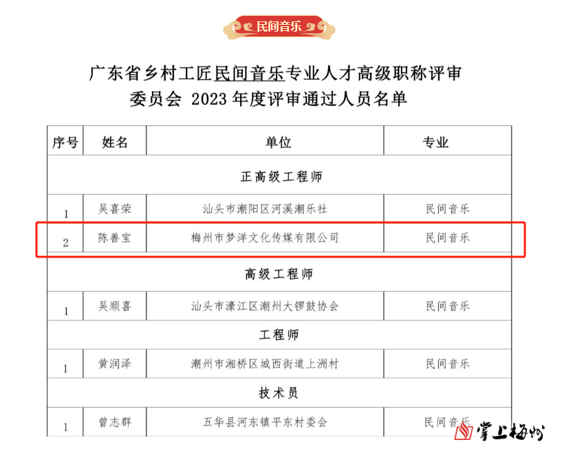 掌上梅州讯 近日,2023年度乡村工匠专业人才高级职称评审结果正式揭晓,梅州知名客家音乐人、梅州市最美文艺志愿者陈善宝凭借卓越的专业能力、突出的艺术成就和广泛的社会影响力,破格获评正高级音乐工程师职称。