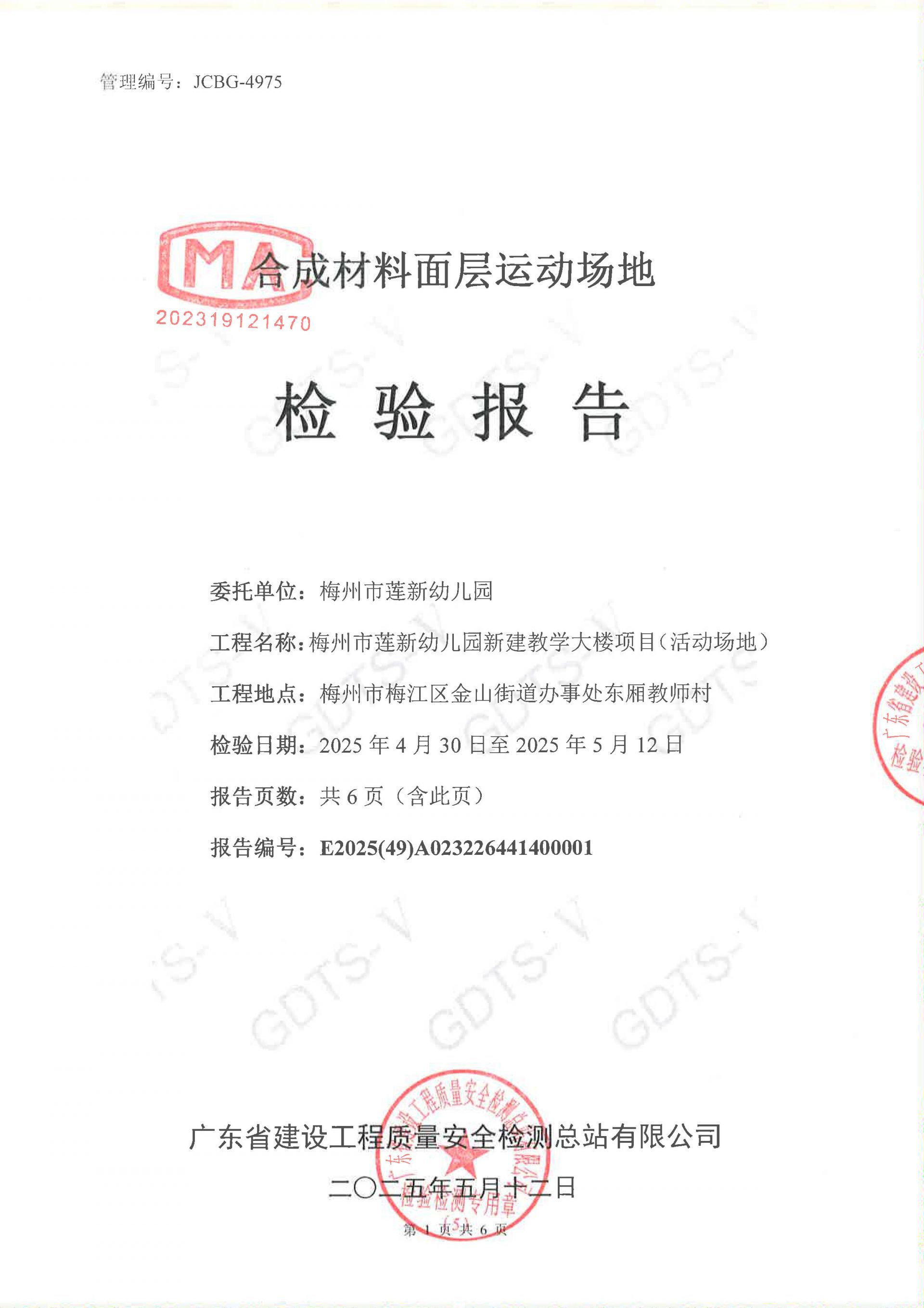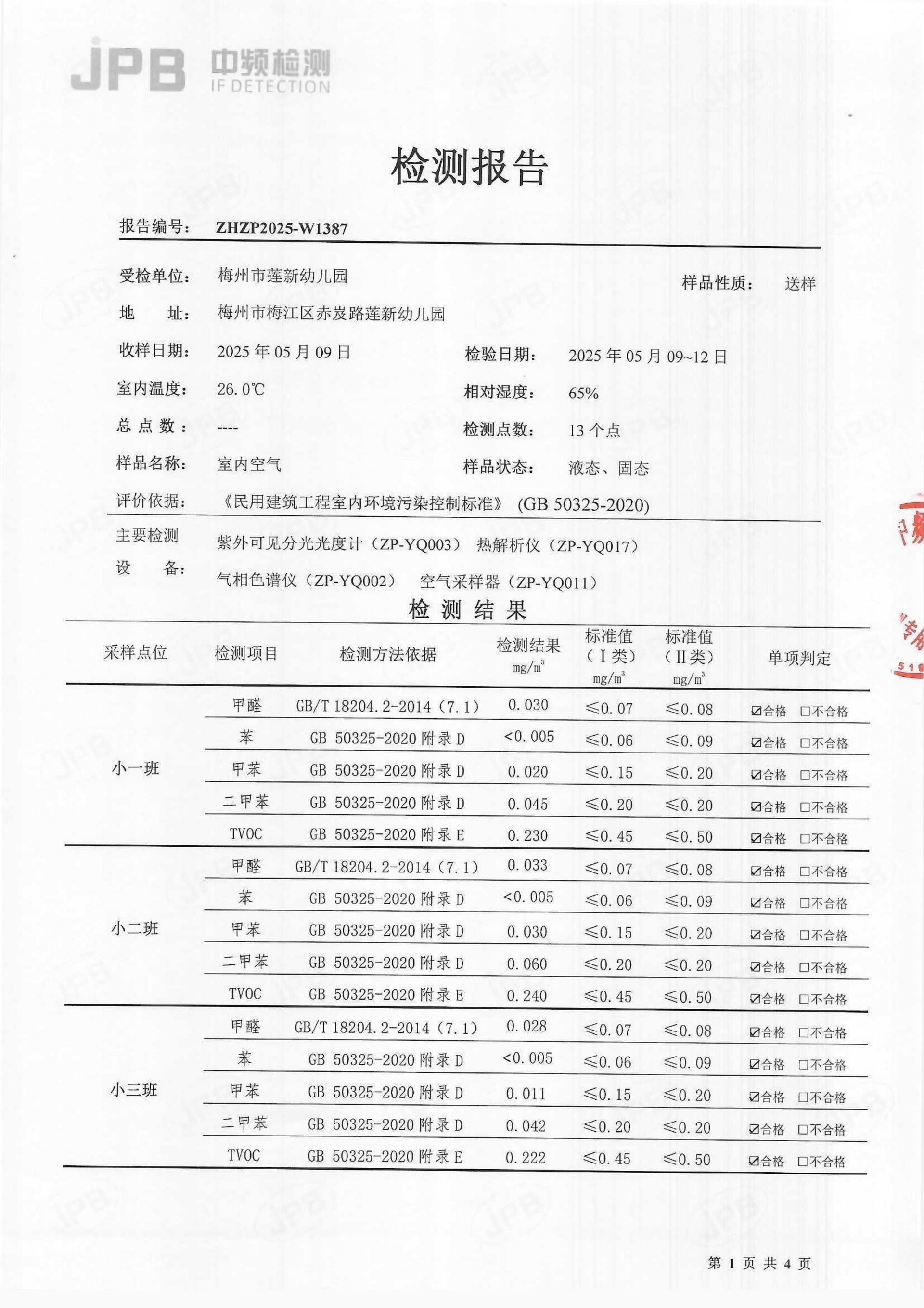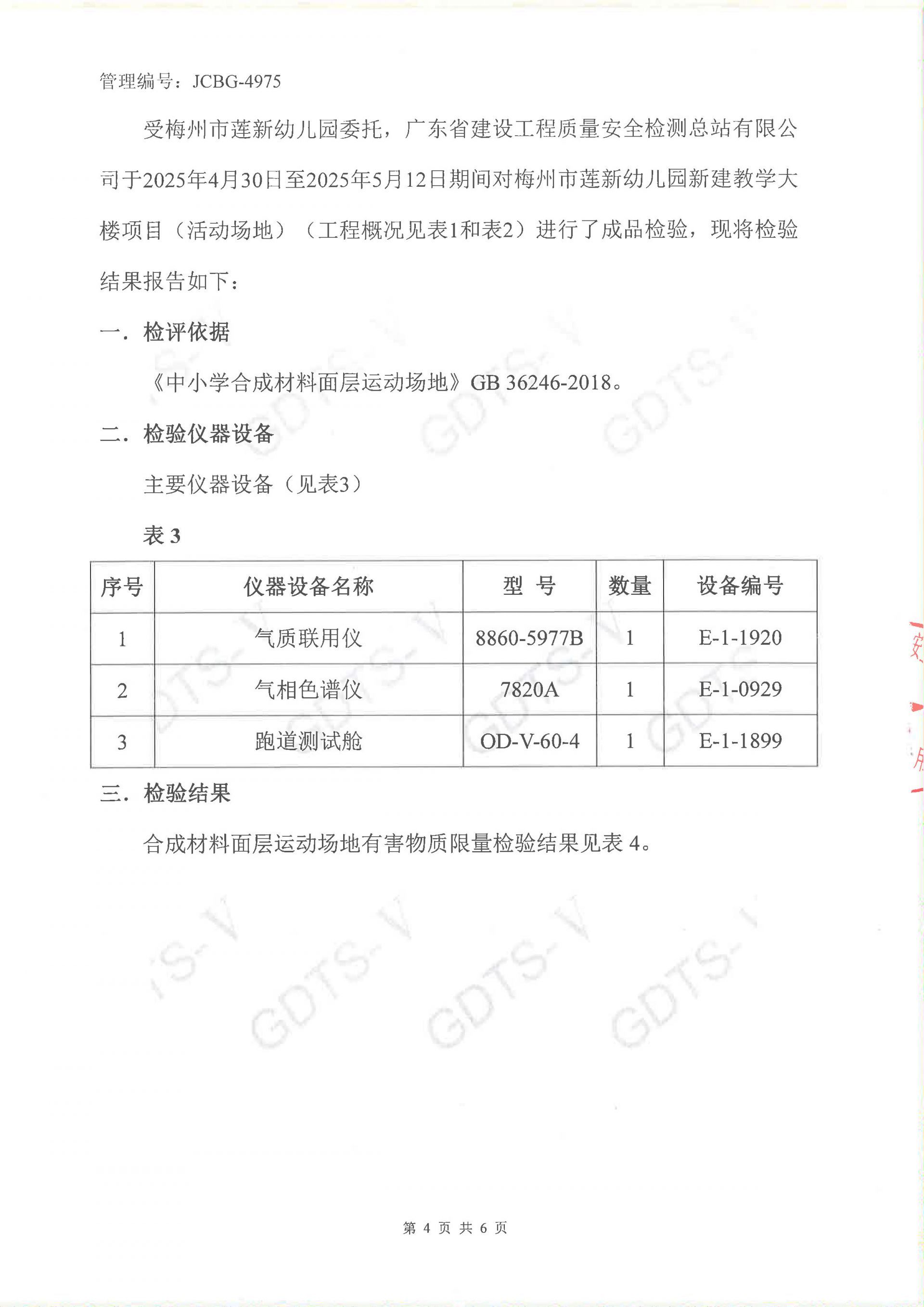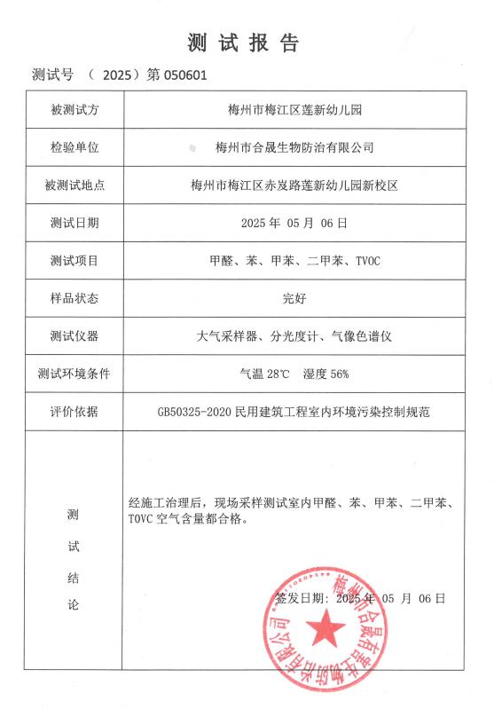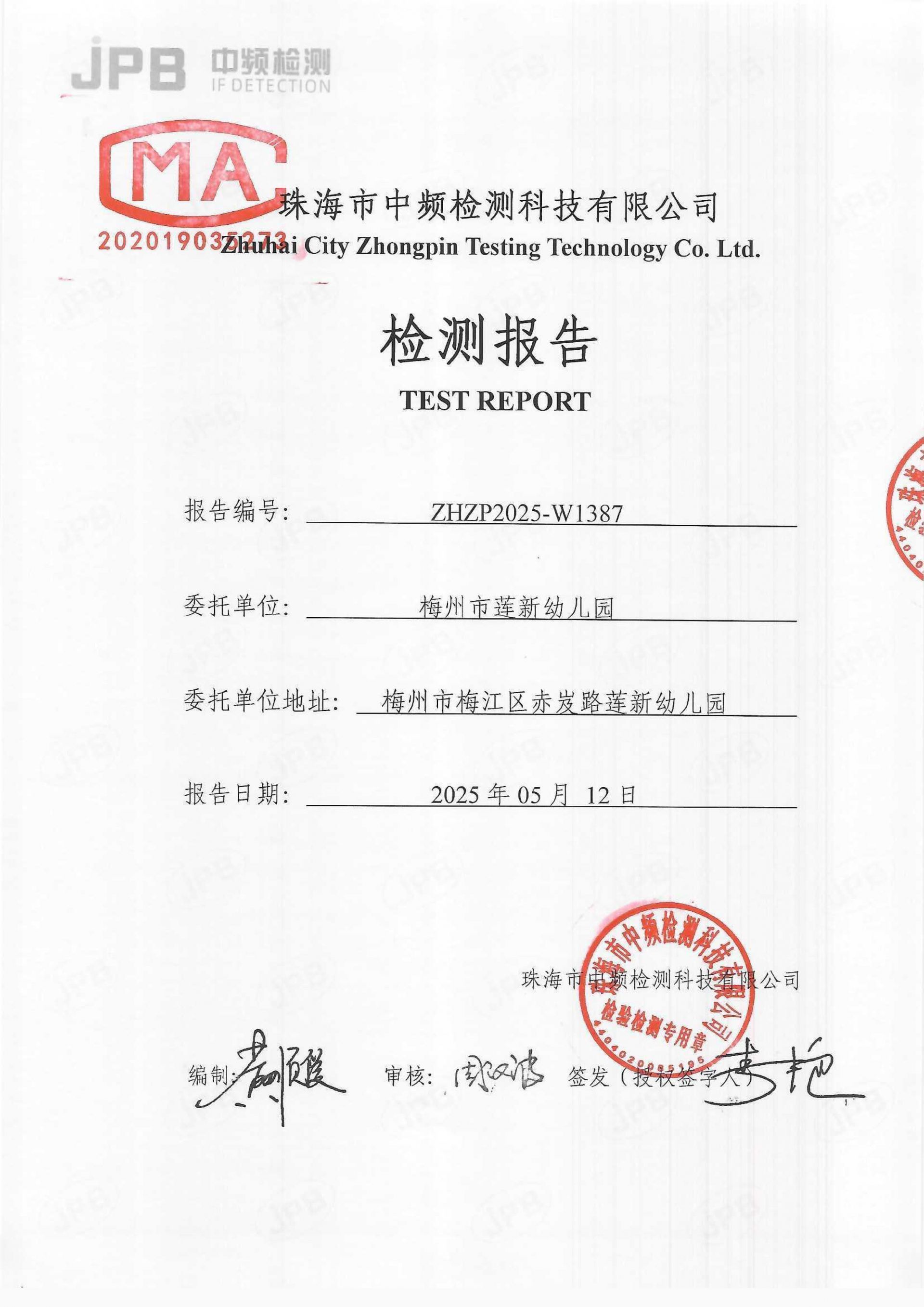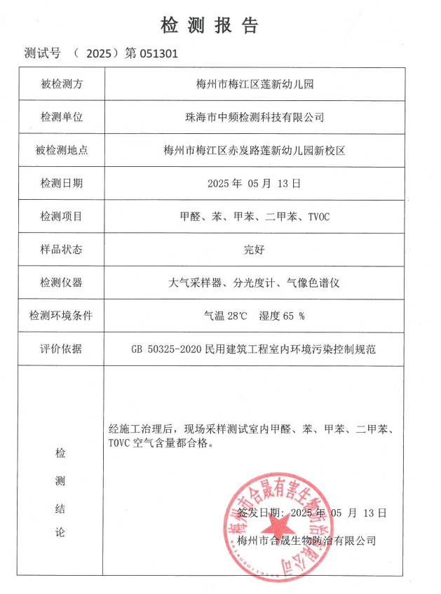 梅州市莲新幼儿园空气质量检测、水质检测、塑胶跑道检测等报告