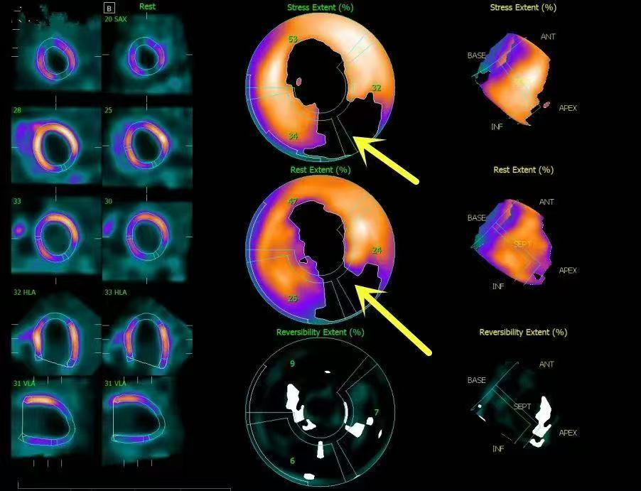 值得一提的是,虽然冠脉血管造影是冠心病诊断的“金标准”,能看到血管是否狭窄,但其无法进一步判断狭窄段血管所支配的区域是否缺血,而心脏ECT能够很清晰地看到心肌是否缺血。如果把心脏比作田地,冠脉血管造影能看到田地里的渠是否通畅,而心脏ECT检查则是看田里有没有水,为治疗提供更精准的依据。