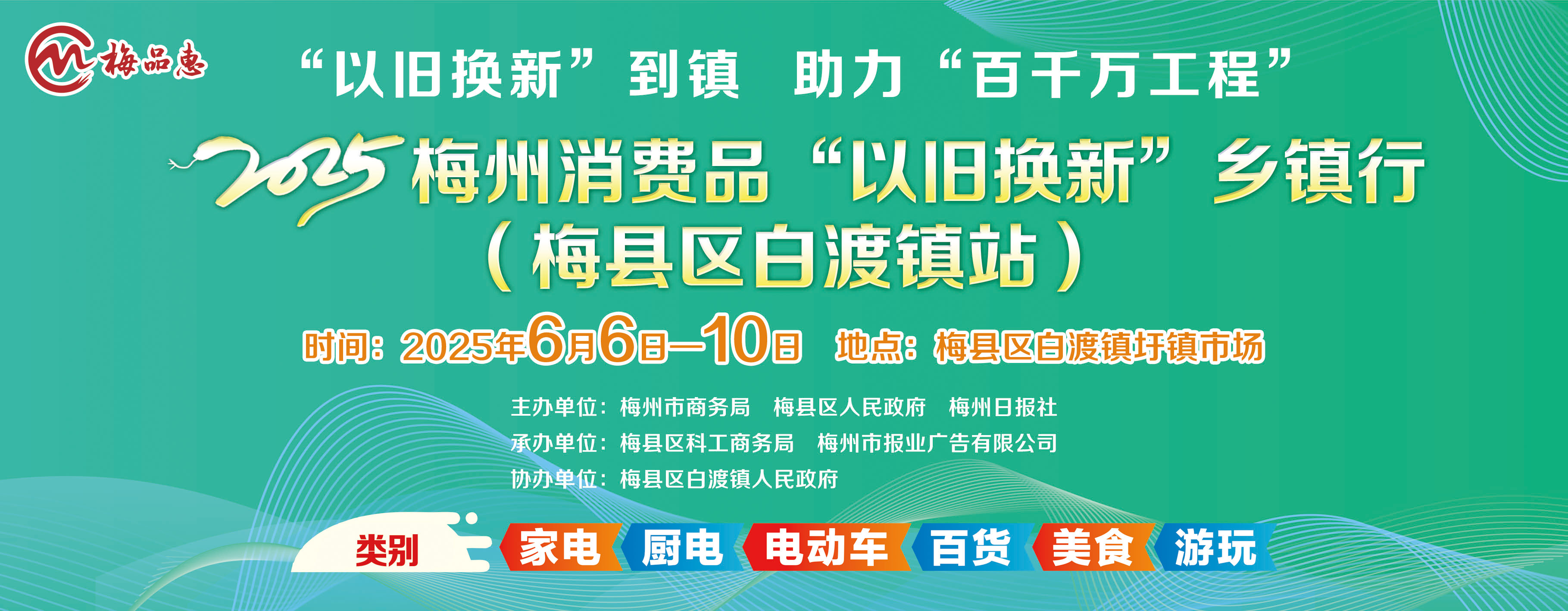 6月6日—10日,由梅州市商务局、梅县区人民政府和梅州日报社联合主办的2025梅州消费品“以旧换新”乡镇行活动将走进宋湘故里——梅县区白渡镇。本次活动以“政府搭台、企业让利、群众受益”为核心,旨在通过“以旧换新”政策引导与市场驱动相结合,推动乡村消费升级,助力绿色经济高质量发展,让白渡镇百姓在家门口畅享品质生活新体验。
