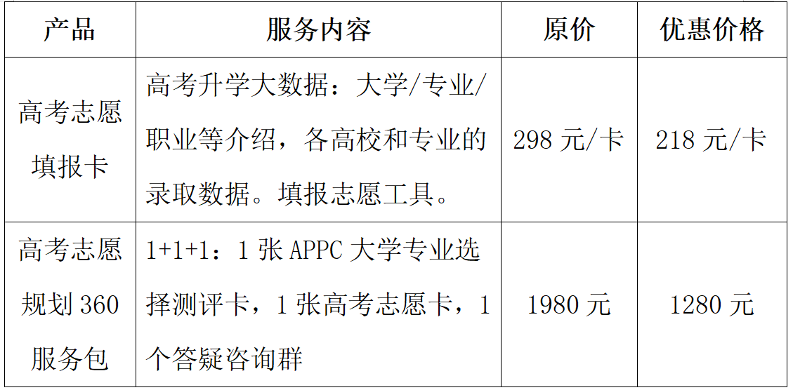1张APPC大学专业选择测评卡,1张高考志愿卡,1个答疑咨询群