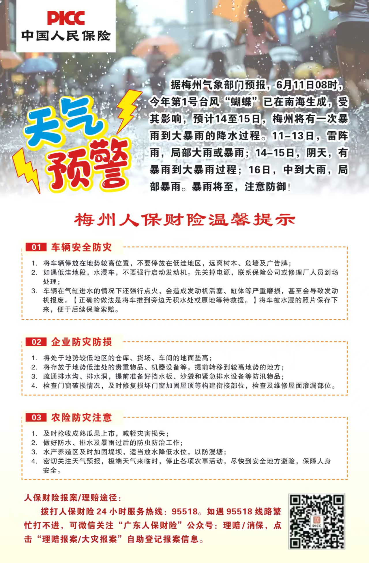 面对台风“蝴蝶”的来袭,人保财险梅州市分公司将持续密切关注台风动态,严格落实各项防范措施,全力以赴保障人民群众生命财产安全和社会稳定,以高度的责任感和使命感,为梅州地区的防灾减灾工作贡献力量。同时呼吁广大市民密切关注台风动态,做好自身防护,遇险情可随时拨打人保财险24小时服务热线95518寻求帮助。