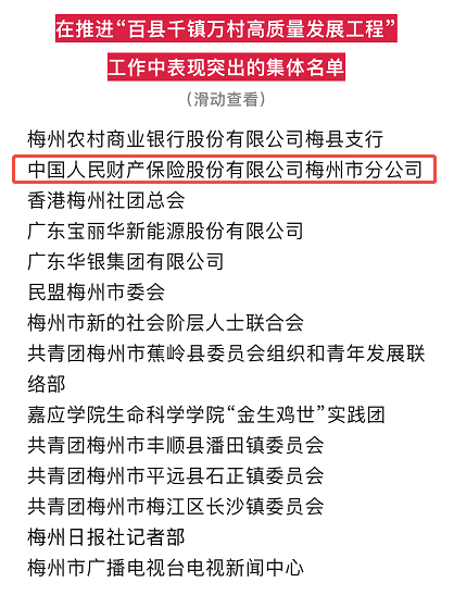 6月12日,中共梅州市委办公室、梅州市人民政府办公室发出通报,对推进“百县千镇万村高质量发展工程”工作表现突出的226个集体和147名个人给予表扬,其中人保财险梅州市分公司获评推进“百县千镇万村高质量发展工程”工作表现突出集体。
