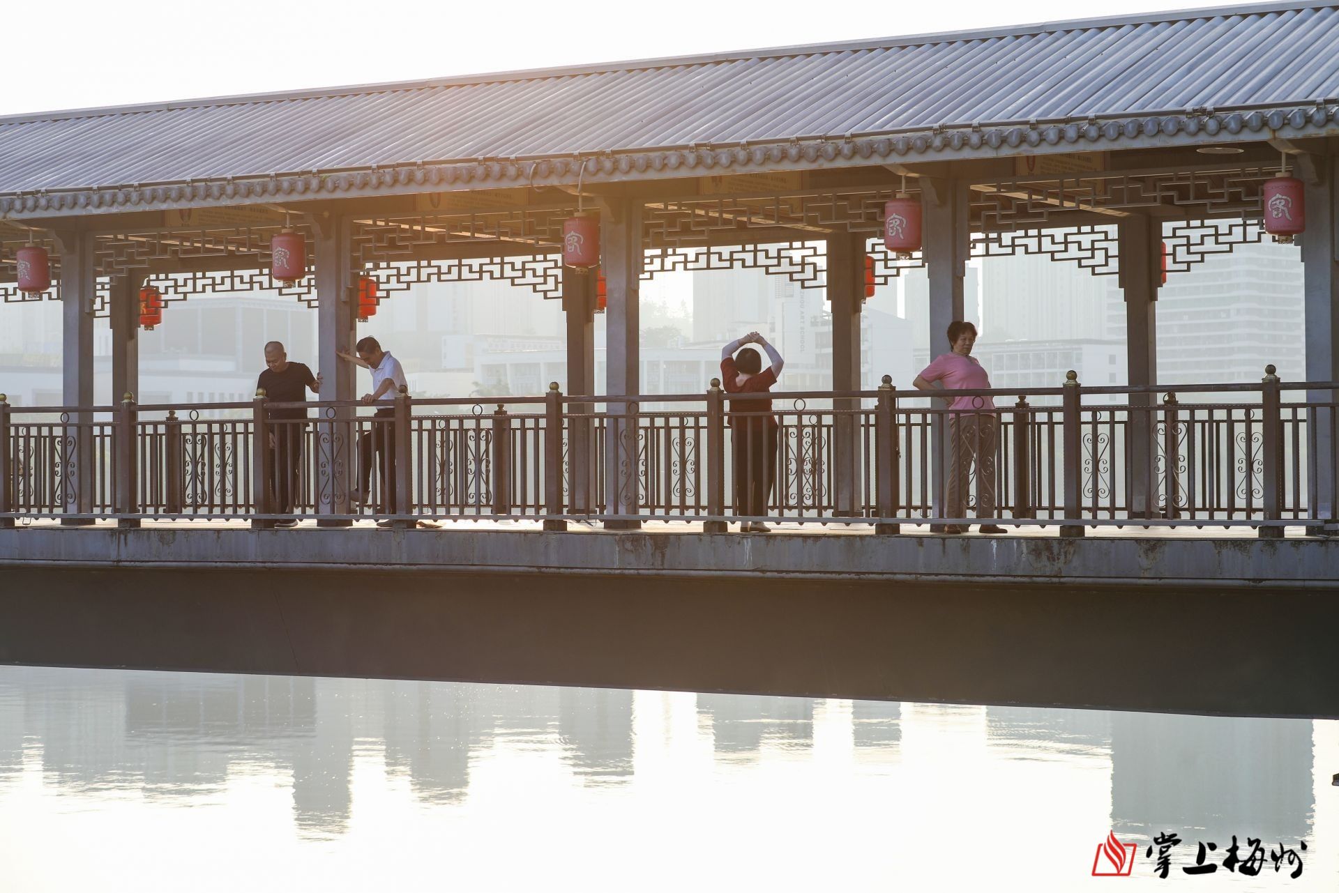 亲水公园浮桥桥头,市民正在栏杆旁或聊天、或锻炼。(吴腾江 摄)