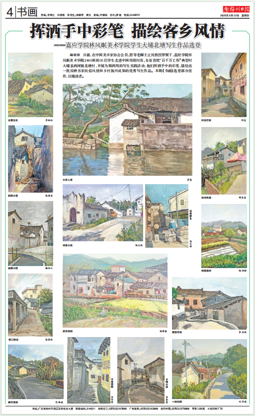 编者按:日前,在中国美术家协会会员、指导老师王立民教授带领下,嘉应学院林风眠美术学院2403班的35位学生走进中国传统村落、全省首批“百千万工程”典型村大埔县西河镇北塘村,开展为期两周的写生实践活动,他们挥洒手中的彩笔,描绘出一批反映客家民俗风情和乡村振兴成果的优秀写生作品。本期《书画》选登部分佳作,以飨读者。