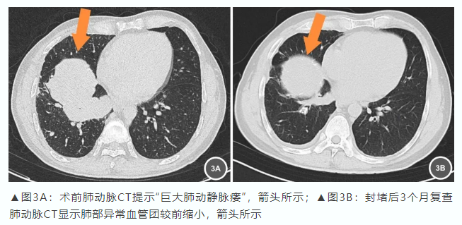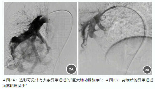 钟炜主任团队仔细评估后,认为患者不用外科开胸,运用微创介入封堵术即可顺利完成手术。手术仅通过大腿根部血管的微小穿刺点送入精密导管,直达肺部病变处,先造影证实存在伴有多条异常通道的“巨大肺动静脉瘘”(图2A),随后成功置入3枚镍钛合金封堵器,术后复查造影提示异常通道血流明显减少,精准“堵闭”了肺血管的异常通道(图2B)。