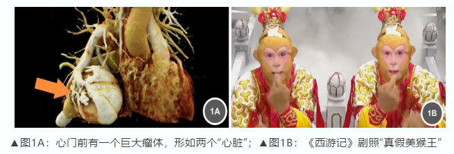 黄叔多年来饱受困扰:稍微一活动就感觉气喘吁吁,嘴唇和指甲常常明显发紫,身体里仿佛氧气“供应不足”。检查发现,他患有一种名为“巨大肺动静脉瘘”的罕见病,简单说就是肺动脉与肺静脉之间本不该存在的“短路”通道(即肺动静脉瘘)异常扩大,未经肺部氧合的血液直接回流心脏,导致全身缺氧。黄叔的术前肺血管CT可见心门前有一个巨大瘤体(图1A,箭头所示),形如两个“心脏”,就好比《西游记》里面的“真假美猴王”(图1B)。
