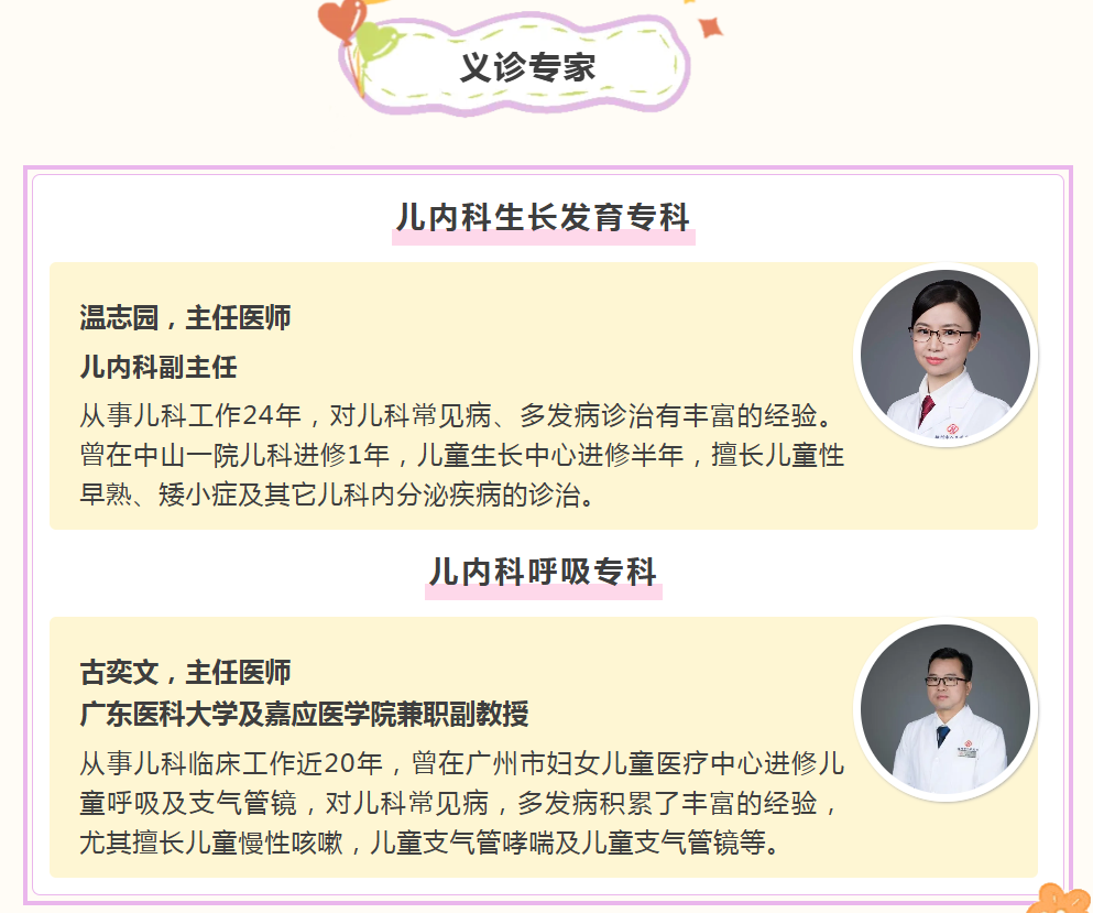 为了更好地关注儿童的健康成长,梅州市人民医院儿内科将于本周日(7月20日)上午举办儿童生长发育义诊活动。本次义诊由梅州市人民医院儿内科儿童生长发育、儿童呼吸专家以及中医科专家组成,通过义诊解答家长的疑问,提高家长对矮小、哮喘等疾病的认识,进一步指导家长如何科学有效地做好孩子疾病的预警监测与日常健康管理。此次义诊,针对每个孩子的情况,专家将制定专属成长方案,全方位助力孩子健康成长。