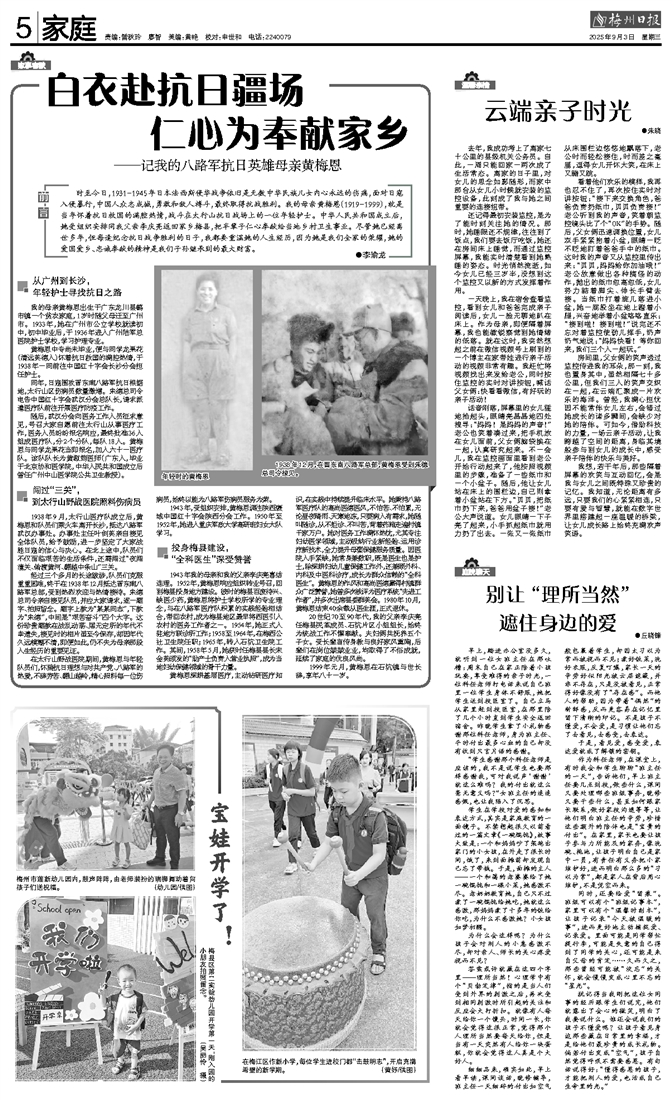 时至今日,1931-1945年日本法西斯侵华战争依旧是无数中华民族儿女内心永远的伤痛,面对日寇入侵暴行,中国人众志成城,勇敢和敌人搏斗,最终取得抗战胜利。我的母亲黄梅恩(1919-1999),就是当年怀着抗日救国的满腔热情,战斗在太行山抗日战场上的一位年轻护士。中华人民共和国成立后,她受组织安排同我父亲李庆亮返回家乡梅县,把半辈子仁心奉献给当地乡村卫生事业。尽管她已经离世多年,但每逢纪念抗日战争胜利的日子,我都要重温她的人生经历,因为她是我们全家的荣耀,她的爱国爱乡、忠诚奉献的精神是我们子孙继承到的最大财富。