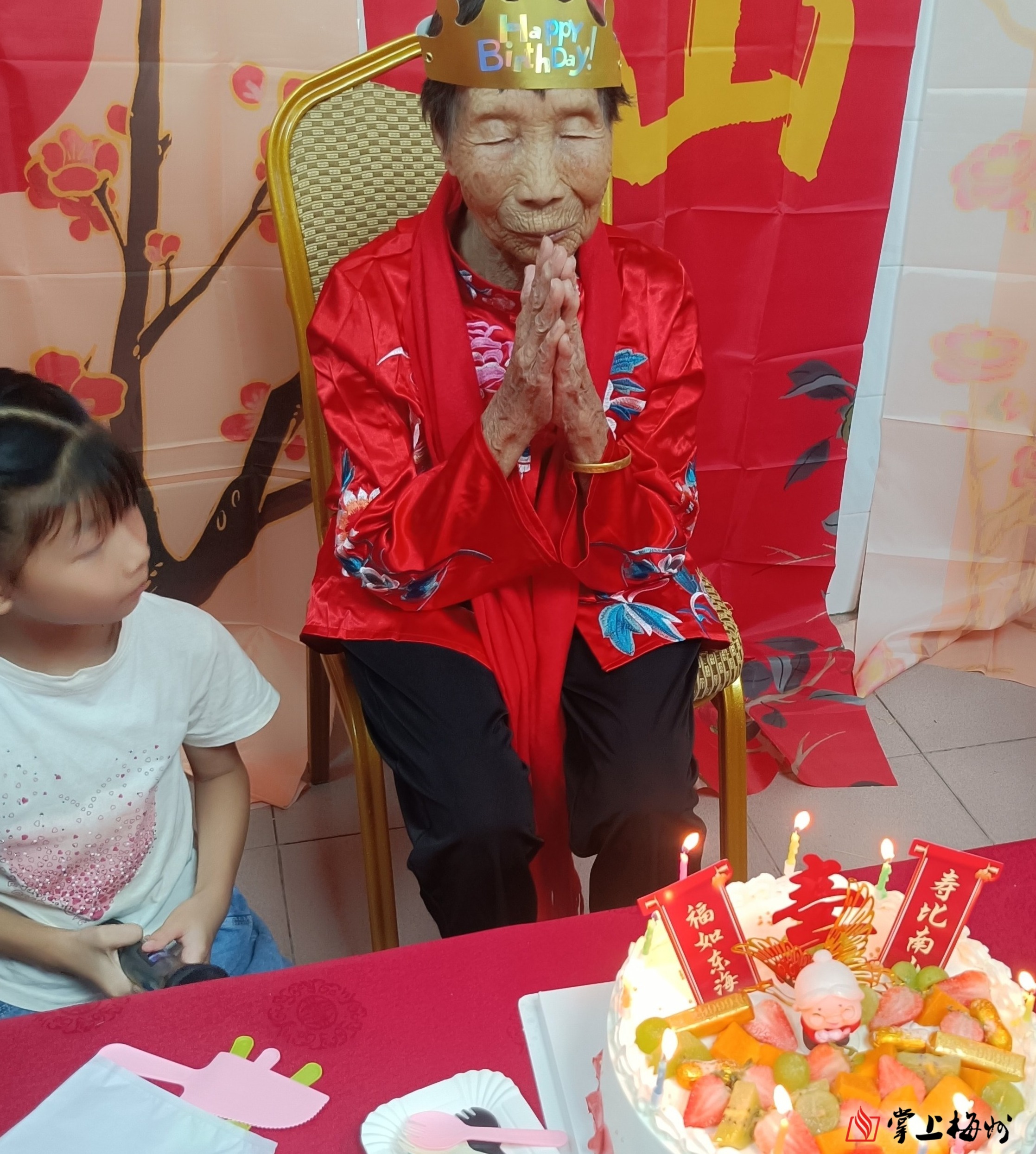 终于到了切蛋糕环节。身形瘦小、满脸雏菊绽放的奶奶双手合十,低头默念心愿。那一刻,她周身仿佛笼罩着一层柔和的光——那是历经百年风雨之后的慈祥与安然,更是四代同堂、承欢膝下的幸福写照。