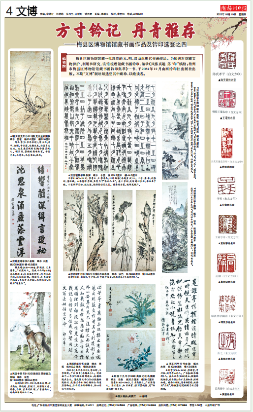 编者按:梅县区博物馆馆藏一批珍贵的元、明、清及近现代书画作品。为加强对馆藏文物保护、利用和研究,该馆梳理馆藏书画钤印,编录《风雅真趣 落“印”缤纷:梅州市梅县区博物馆馆藏书画钤印集萃》一书,于2024年12月由西泠印社出版社出版。本期“文博”版继续选登其中藏珍,以飨读者。