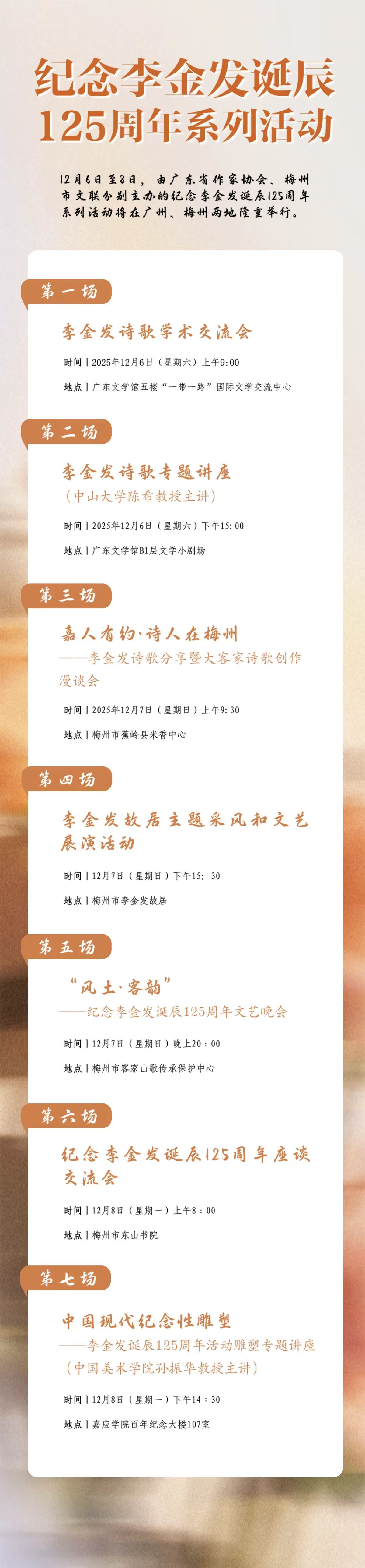 12月6日至8日,由广东省作家协会、中共梅州市委宣传部和梅州市文联联合举办的纪念李金发诞辰125周年系列活动将在广州、梅州两地举行。据悉,今年是李金发诞辰125周年。启动筹备工作以来,梅州市文联、梅州市作协等筹备单位充分听取社会各界的意见,经反复研究论证,精心策划了系列活动,将于12月6日在广东文学馆举行“李金发诗歌学术交流会”“李金发诗歌专题讲座”,于12月7日、8日在梅州举行“李金发故居主题采风和文艺展演”“‘风土·客韵’专场文艺晚会”“纪念李金发诞辰125周年交流座谈会”和“李金发雕塑艺术专题讲座”等一系列活动。