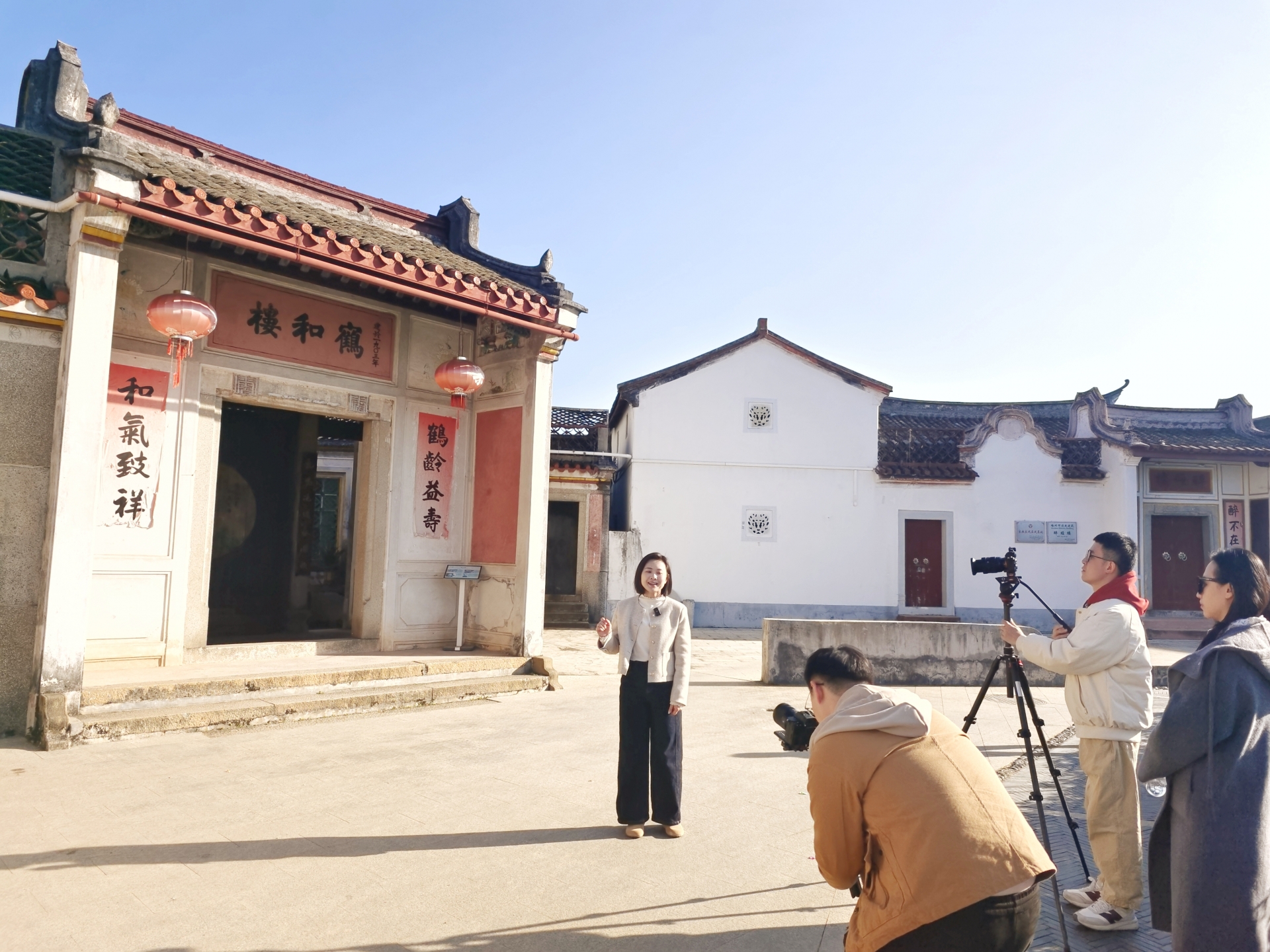 ▲摄制组在望杏坊鹤和楼取景,了解梁伯聪家族故事及鹤和楼活化利用情况。