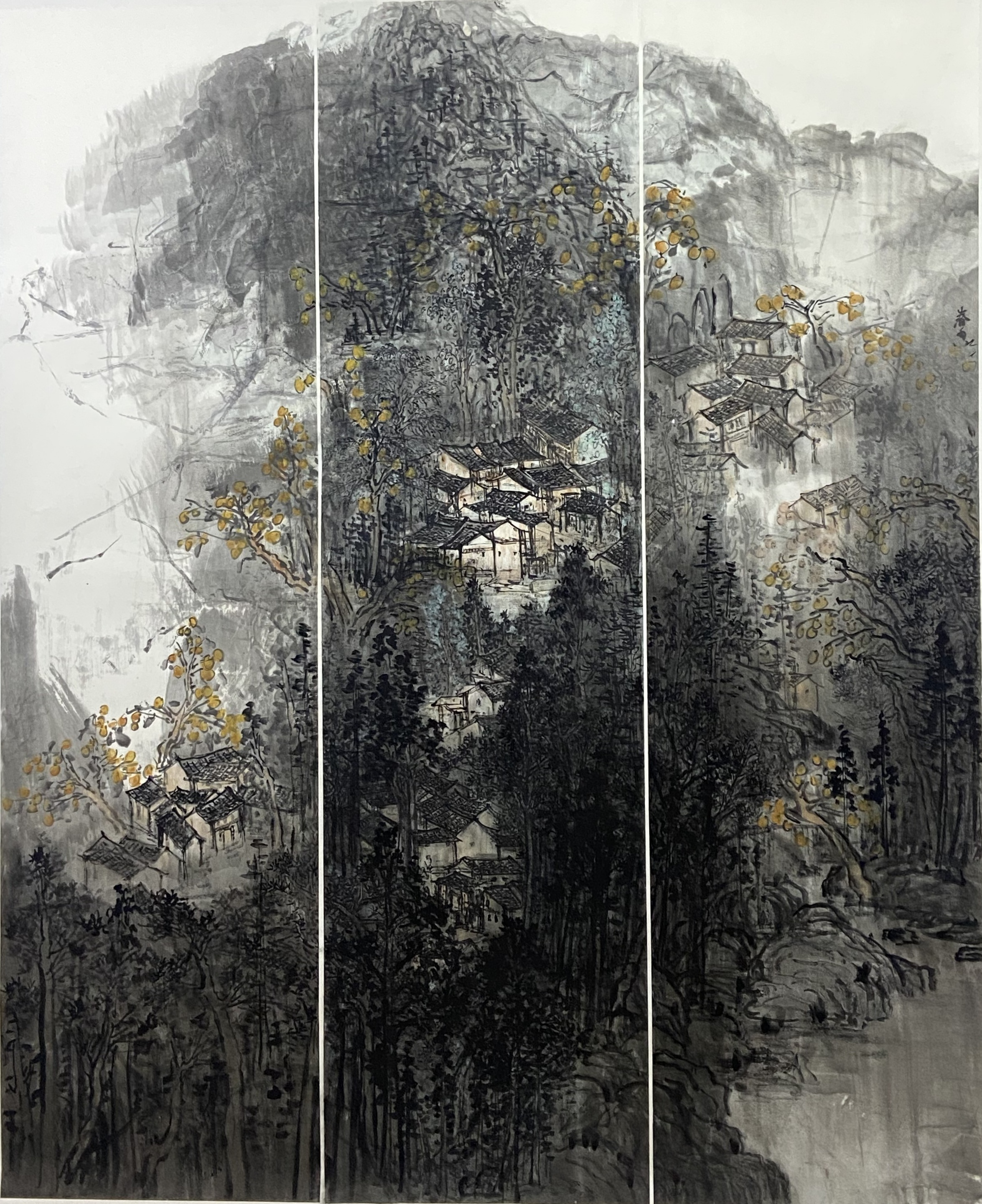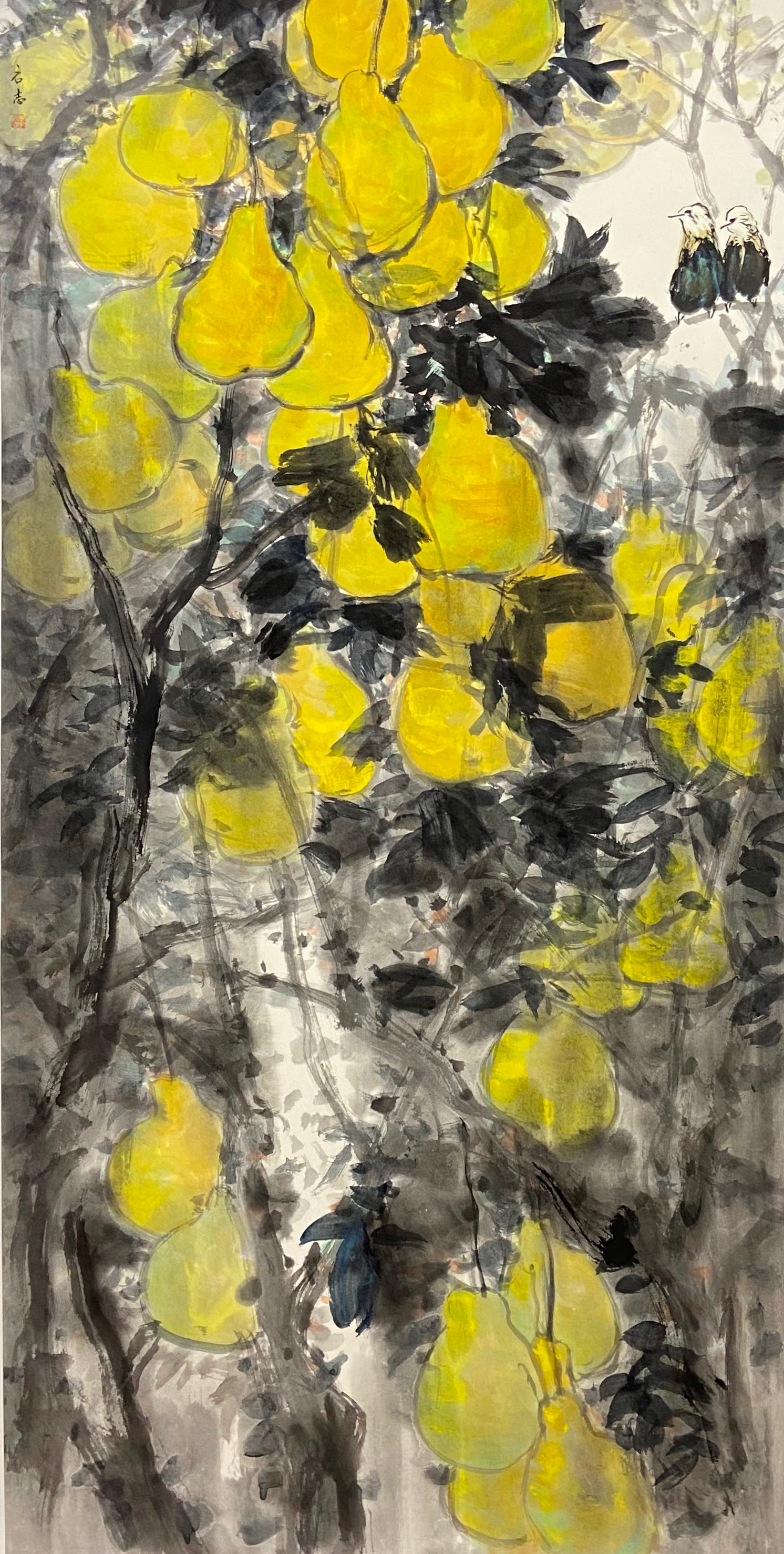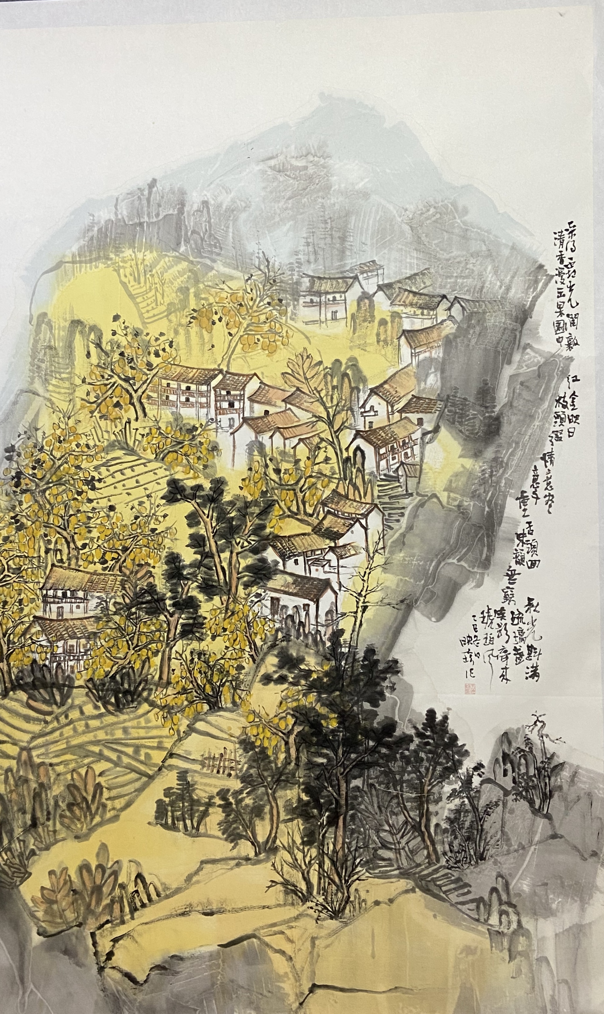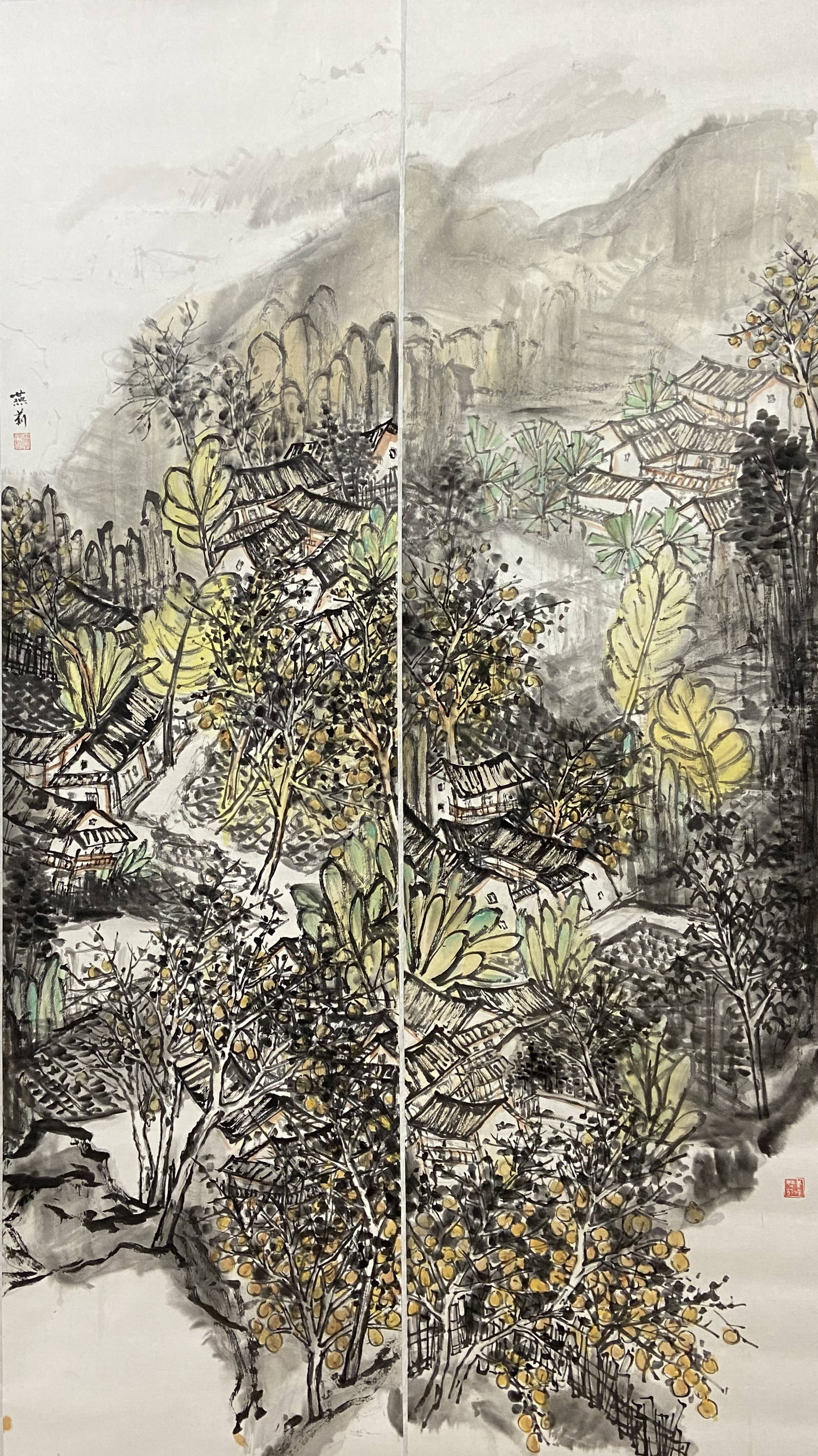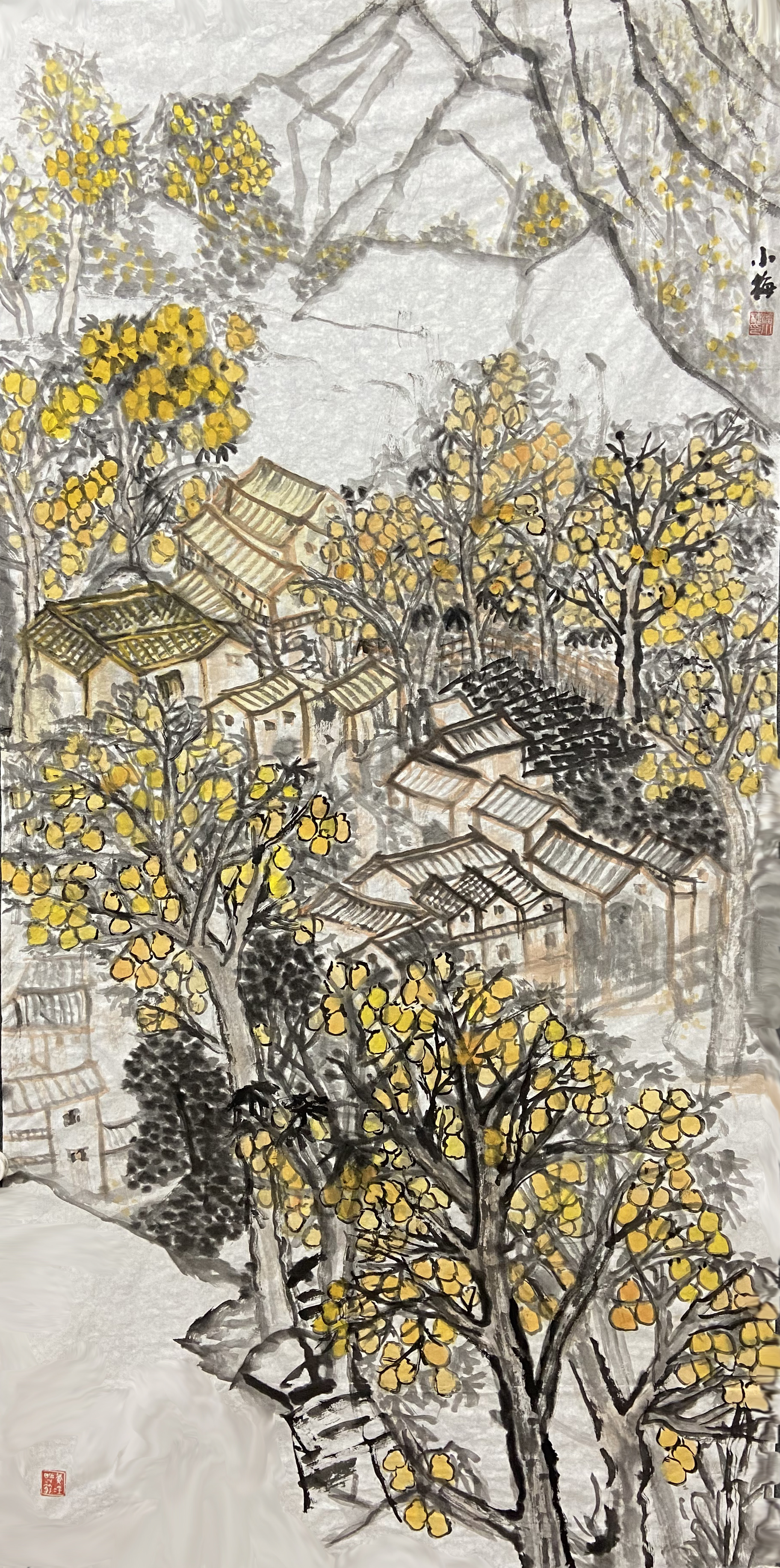 ▲潘小梅《疏枝金柚盈客村》 138x69cm