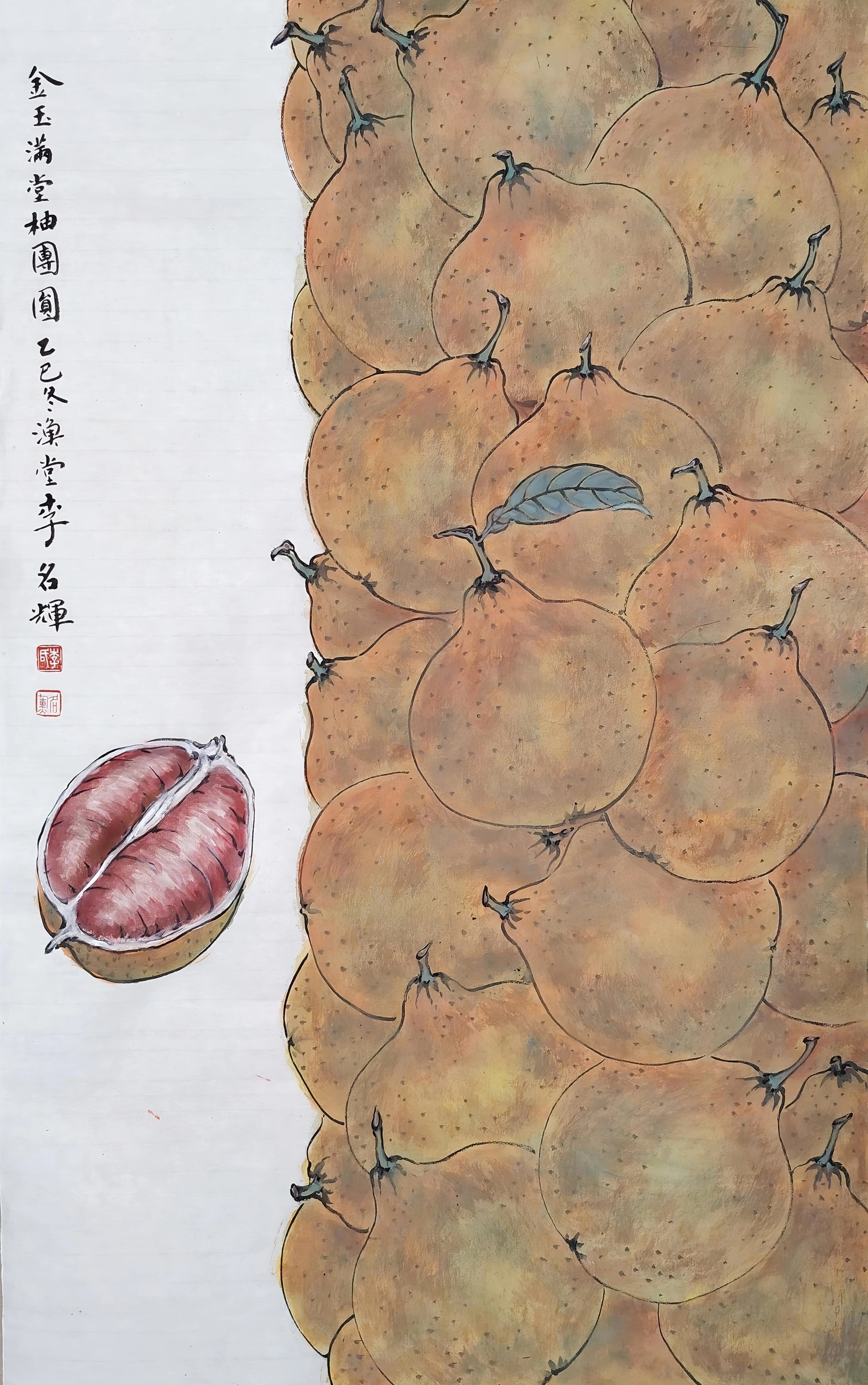 ▲李名辉《金玉满堂柚团圆》68x45cm