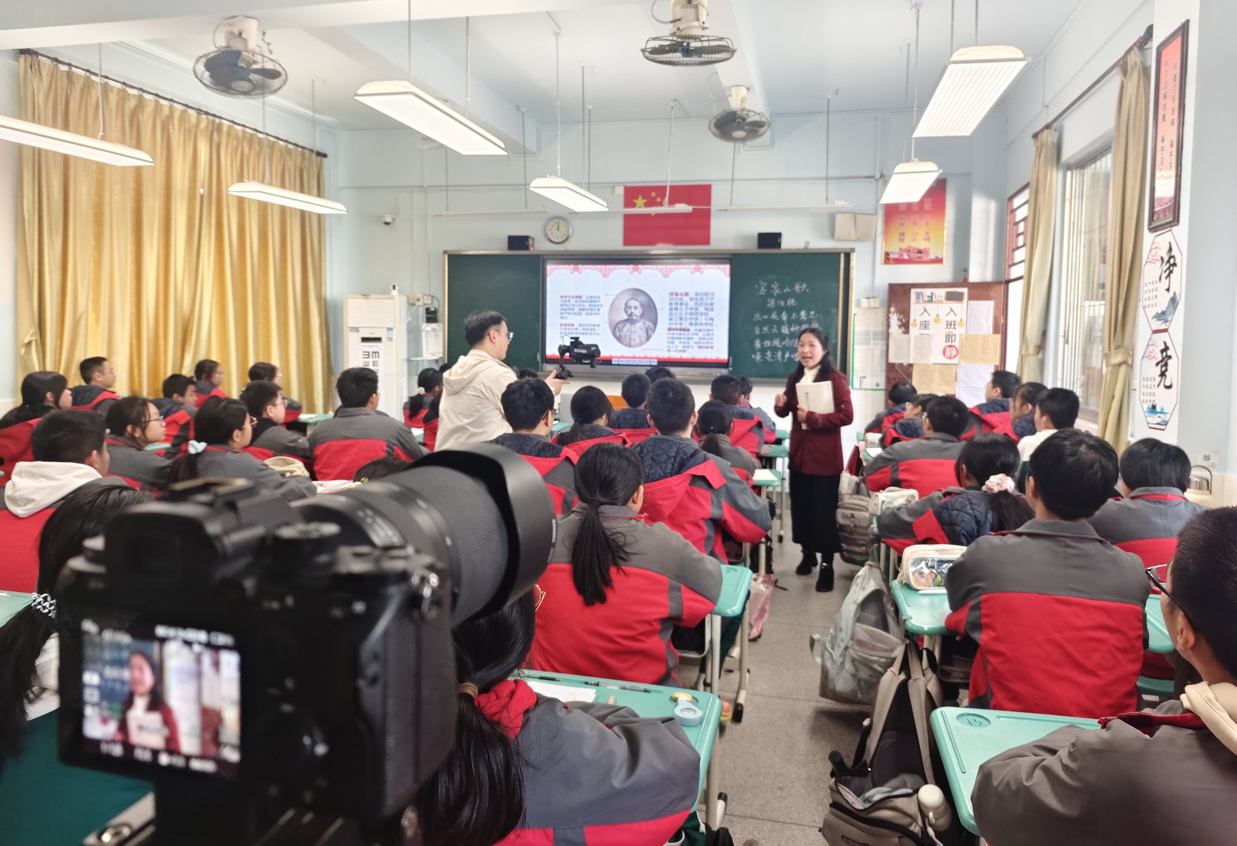 ▲梅州中学罗雪娇老师在课堂上给学生讲授梁伯聪诗作《梅县风土二百咏》