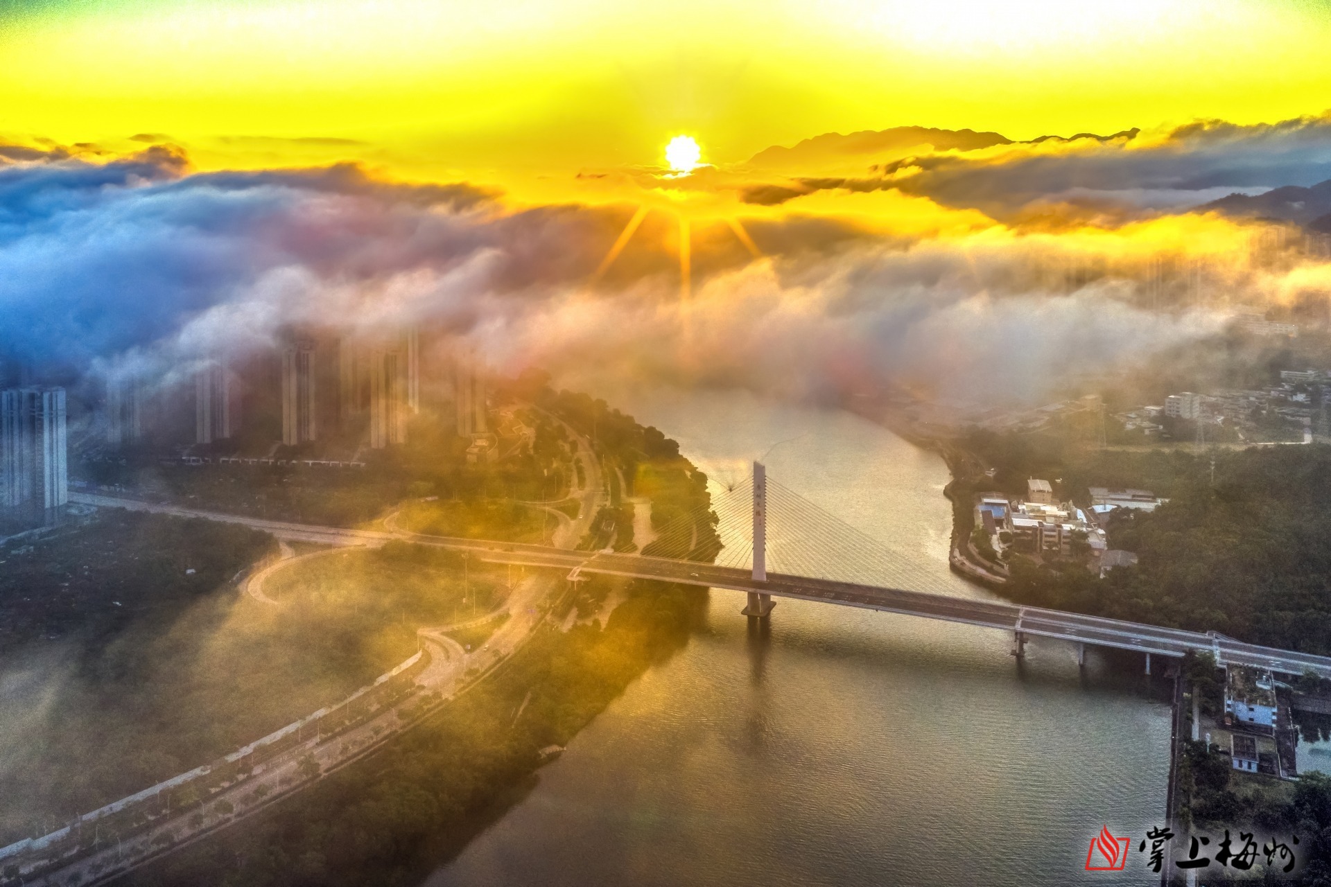 朝阳穿破云层,阳光气势磅礴地倾泻在梅江两岸。(何方 摄)