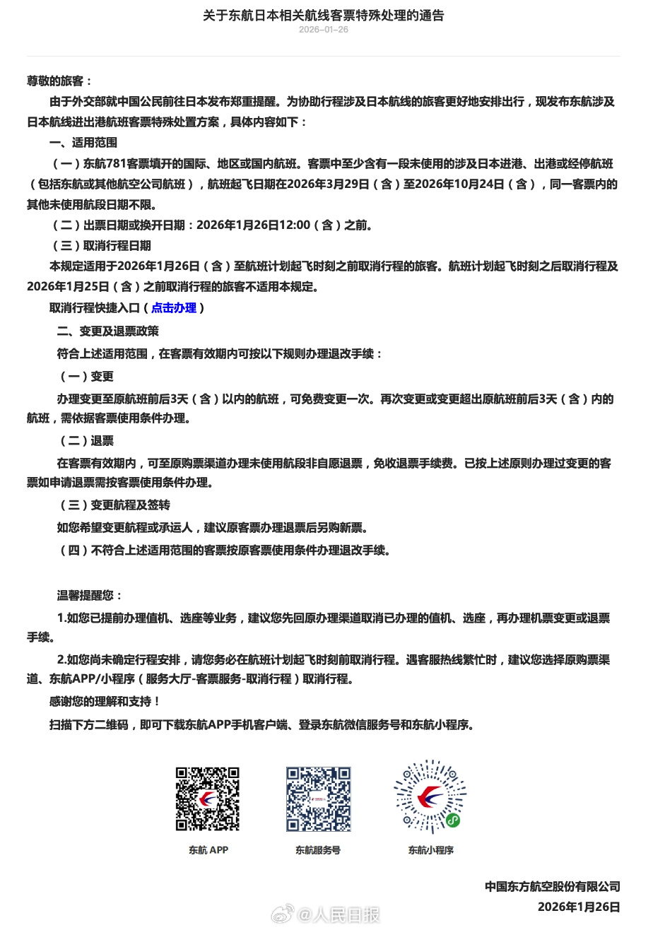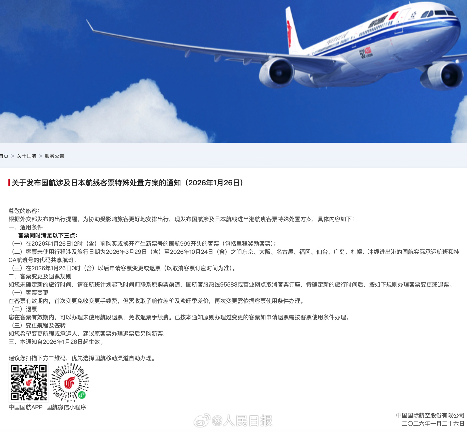 国航、南航、东航1月26日发布公告称,根据外交部发布的出行提醒,为协助受影响旅客更好安排出行,针对1月26日12时前已购买、旅行日期为3月29日至10月24日的上述航空公司日本航线进出港航班客票,可办理免费退改手续。
