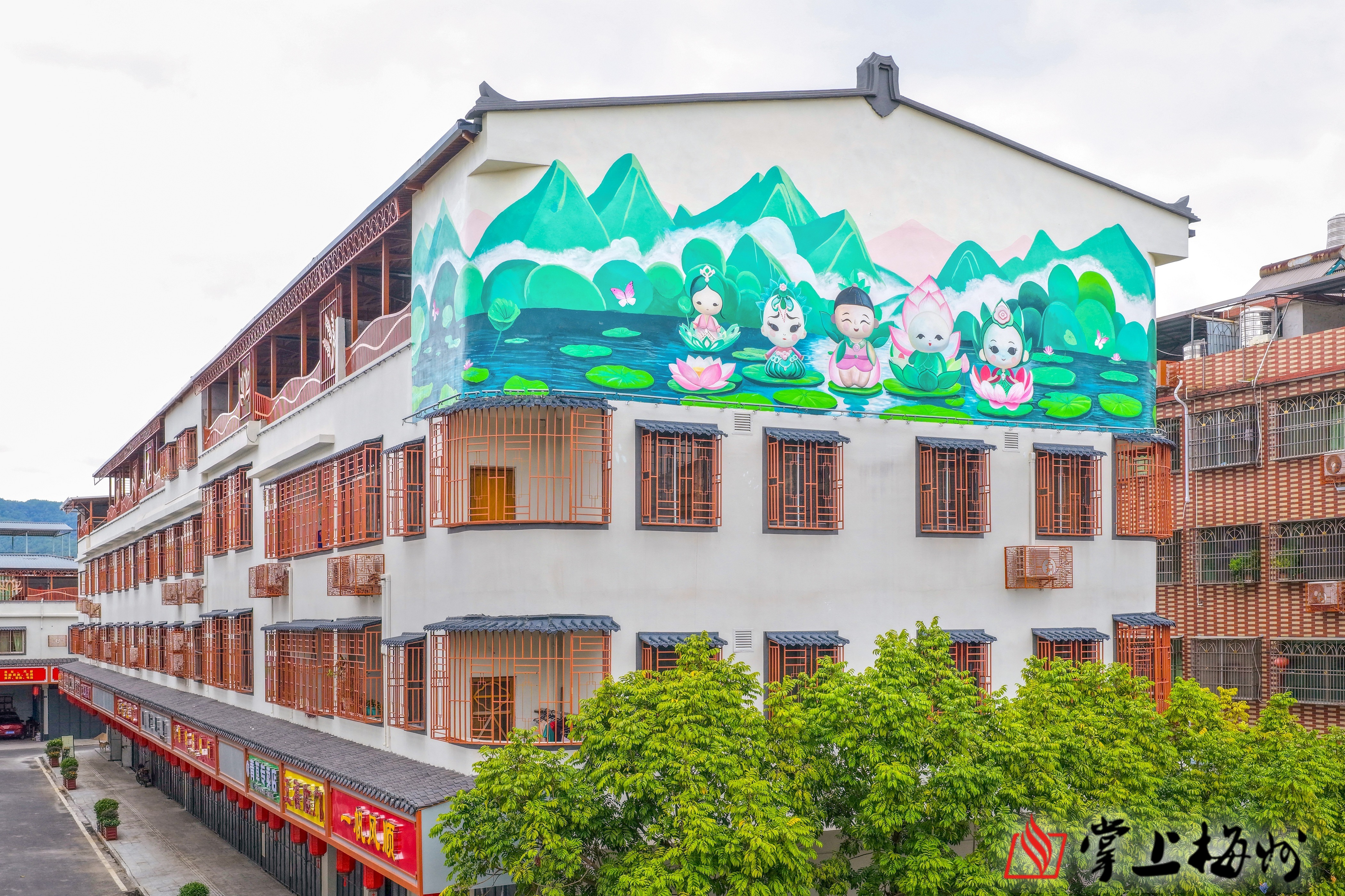 蕉岭县三圳镇推进圩镇店招规范化改造、绘制本土“荷”主题彩绘,彰显“鱼米之乡”韵味。(丘林强 摄)