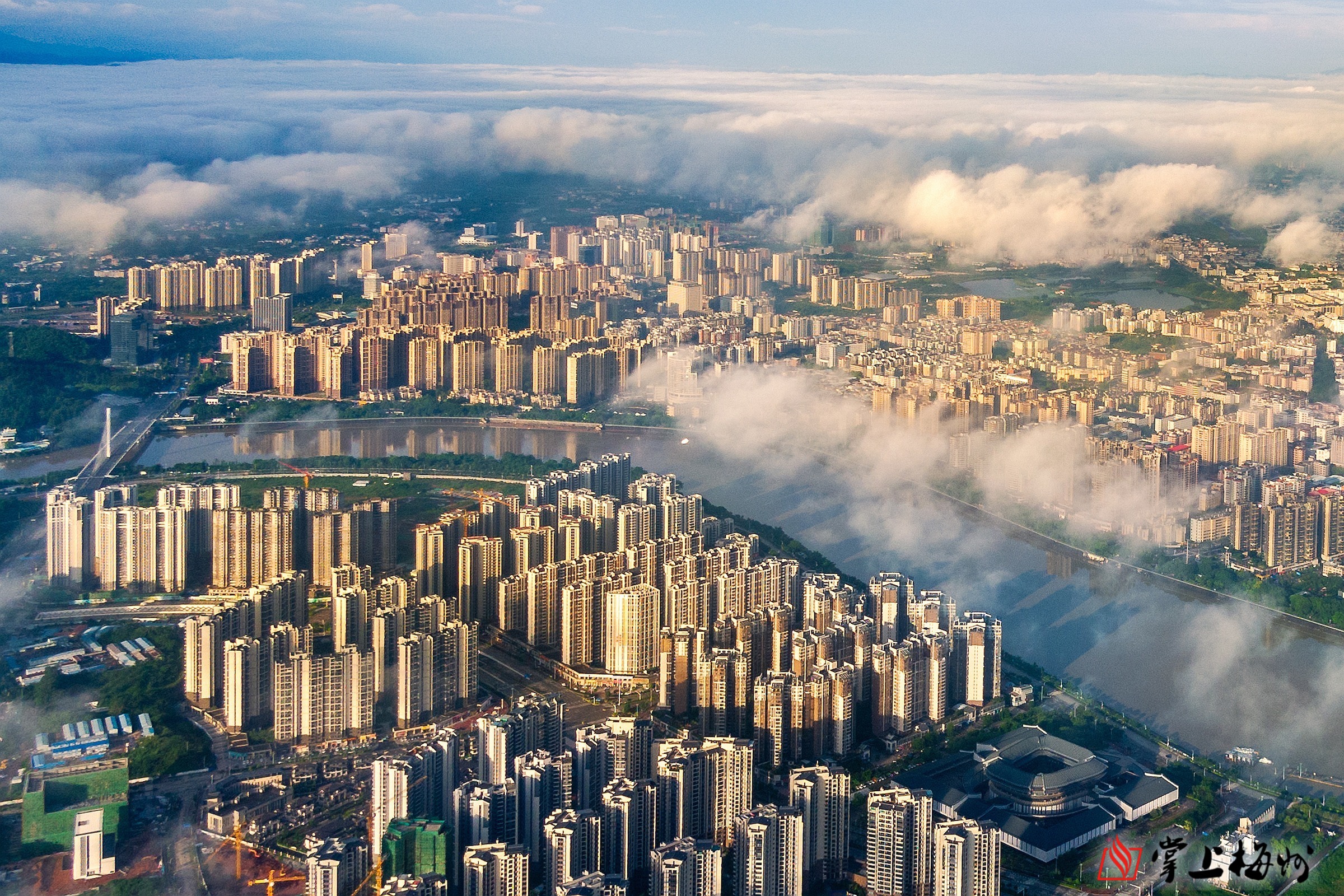 云海在阳光轻抚下缓缓退散,梅州城区高楼与河道渐次明晰,城市如刚揭纱的画卷,在山水间舒展现代与自然交融的独特景致。(连志城 摄)
