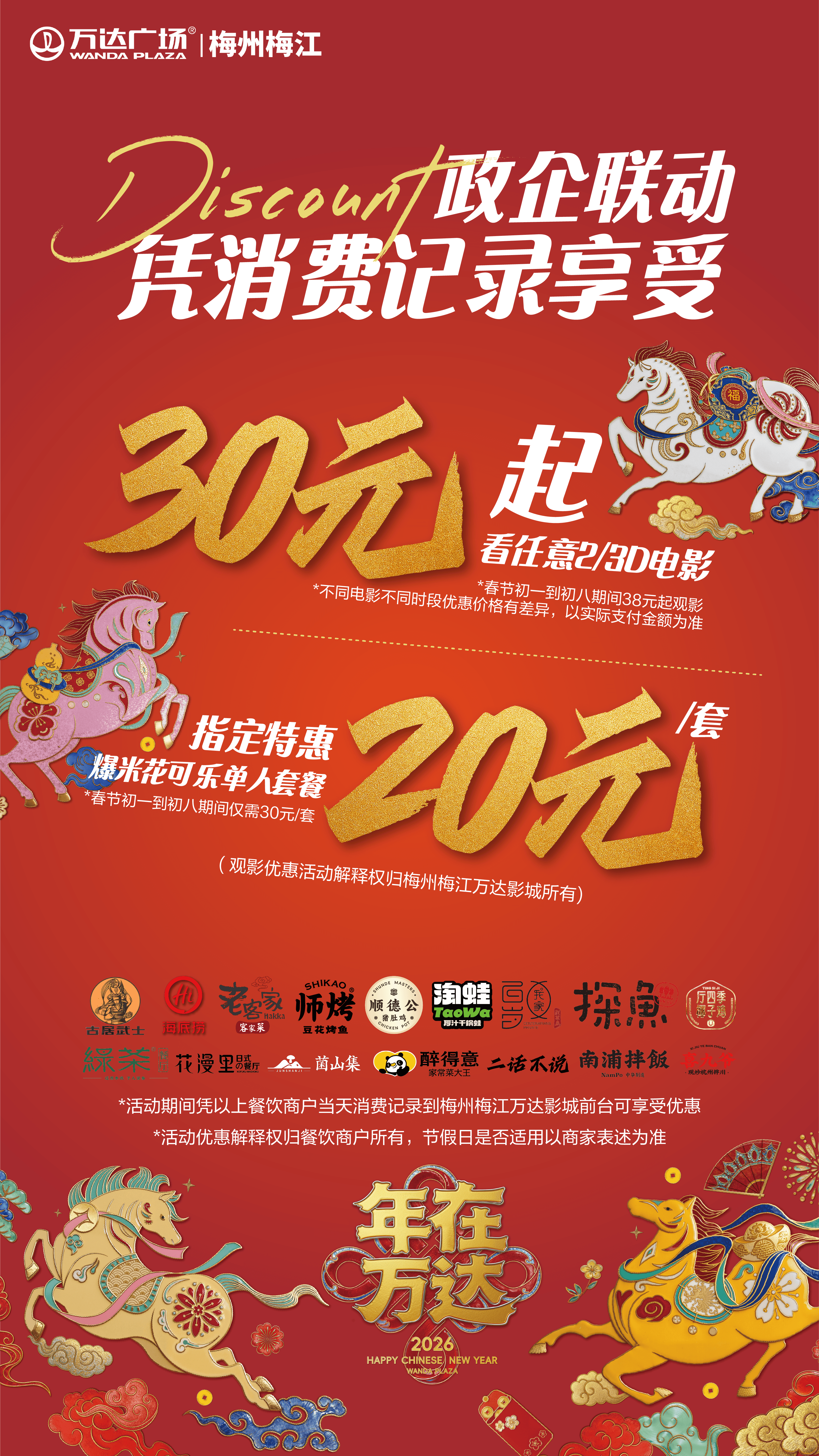 记者在现场获悉,根据初步协议,2026年2月9日至12月31日活动期间,消费者凭梅州梅江万达影城当天电影票根到万达广场及梅城20多家餐饮商户就餐可享受八折到九五折不等的优惠;与此同时,消费者凭相关餐饮商户当天消费记录到梅州梅江万达影城前台可享受30元起观看任意2D、3D电影(春节初一到初八期间38元起观影)等优惠(详情以影院与餐饮企业签订的协议具体内容为准,节假日是否适用以商家表述为准)。