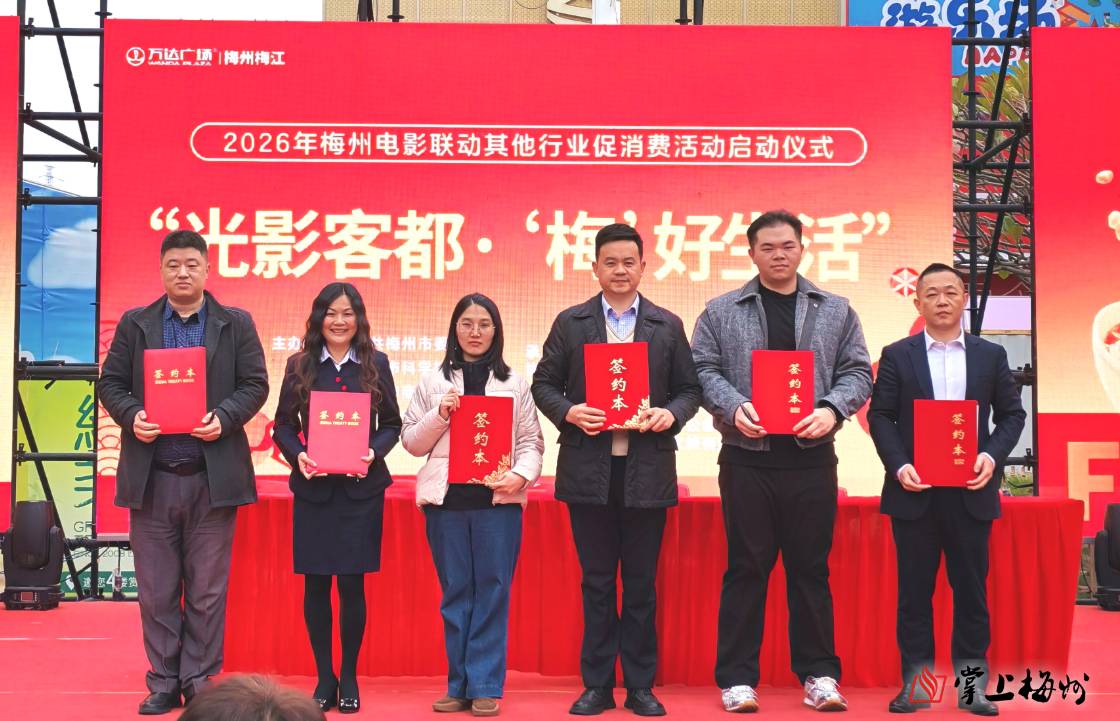现场举行意向合作签约仪式。电影院代表和旅游企业代表、电影院代表和市餐饮行业协会代表、电影院代表和市科普企业代表、电影院代表和文创产品企业代表等分别签订意向合作协议,共同开展好2026年梅州电影促其他行业消费活动。