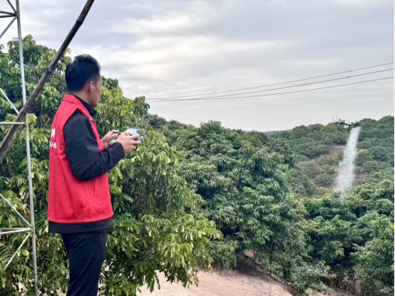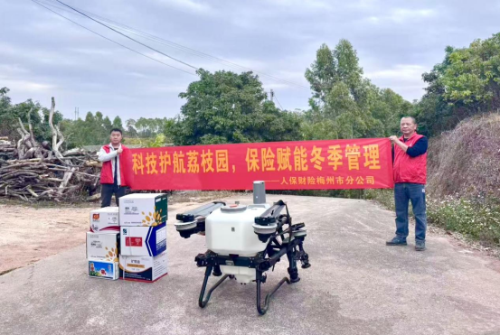 现场,多架植保无人机在技术员操控下腾空而起,沿着规划航线低空掠过成片荔林,雾化后的药剂均匀附着于枝干与叶片,相比传统人工作业,效率提升10倍以上。本次飞防作业集防冻、防病、防虫于一体,实现多重防控,可有效压低蚜虫、红蜘蛛、霜疫霉病、炭疽病及蒂蛀虫越冬基数。据工作人员介绍,“我们不仅提供风险补偿,更注重前端风险预防。通过飞防作业,帮助果农守住‘越冬关,从源头上减少灾害损失,真正实现减损增效。”