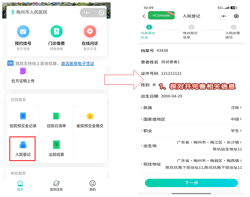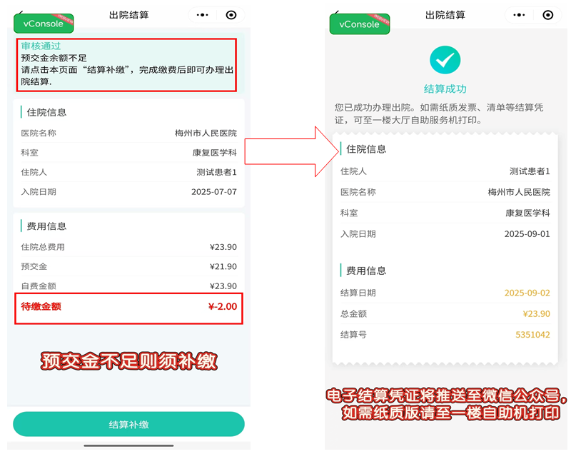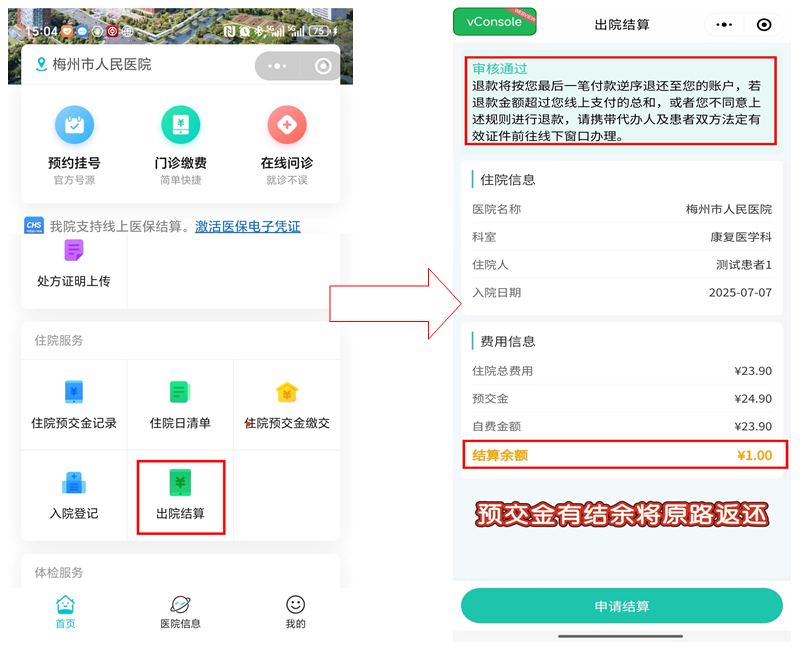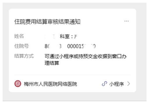 接到护士出院通知后,关注梅州市人民医院微信公众号推送的“出院结算提醒”→“审核通过”即可点击链接完成结算(若提示“审核拒绝”则需携带有效证件及预交金收据前往窗口办理)。