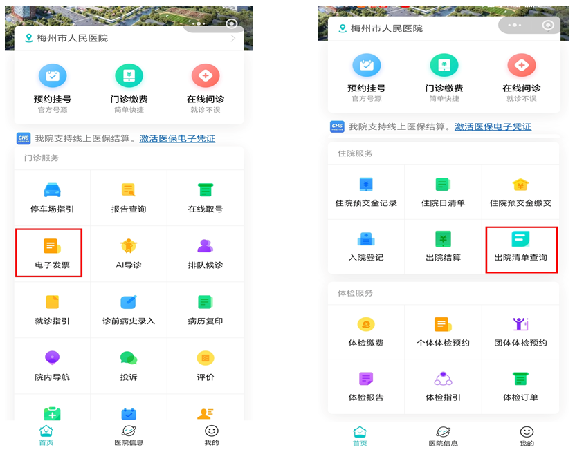 获取方式:结算完成后,医院微信公众号将自动为您推送电子发票及结算清单。