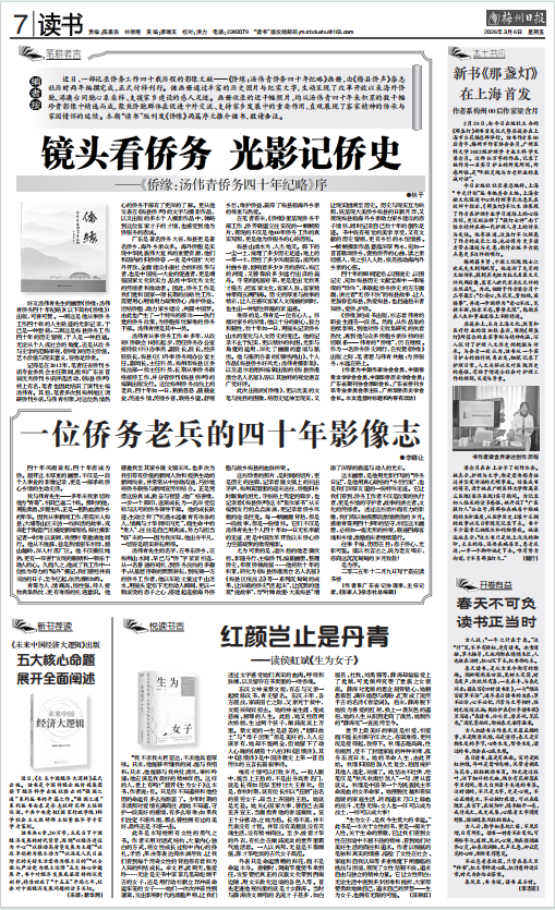 编者按:近日,一部记录侨务工作四十载历程的影像文献——《侨缘:汤伟青侨务四十年纪略》画册,由《梅县侨声》杂志社历时两年编撰完成,正式付梓刊行。该画册通过丰富的历史图片与纪实文字,生动呈现了改革开放以来海外侨胞、港澳台同胞心系桑梓、支援家乡建设的感人足迹。画册收录的的近千幅照片,均从汤伟青四十年来积累的数千幅珍贵影像中精选而成,聚焦侨胞群体在促进中外交流、支持家乡发展中的重要作用,直观展现了客家精神的传承与家国情怀的延续。本期“读书”版刊发《侨缘》两篇序文推介该书,敬请垂注。