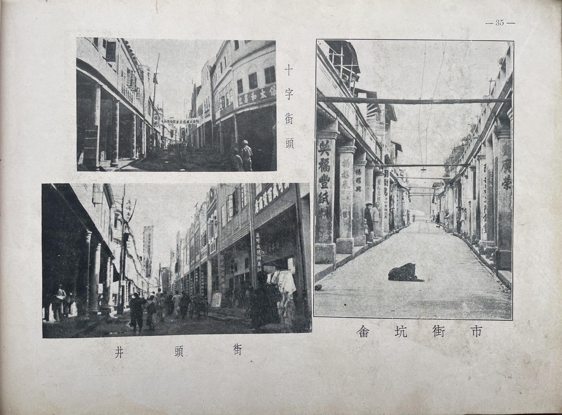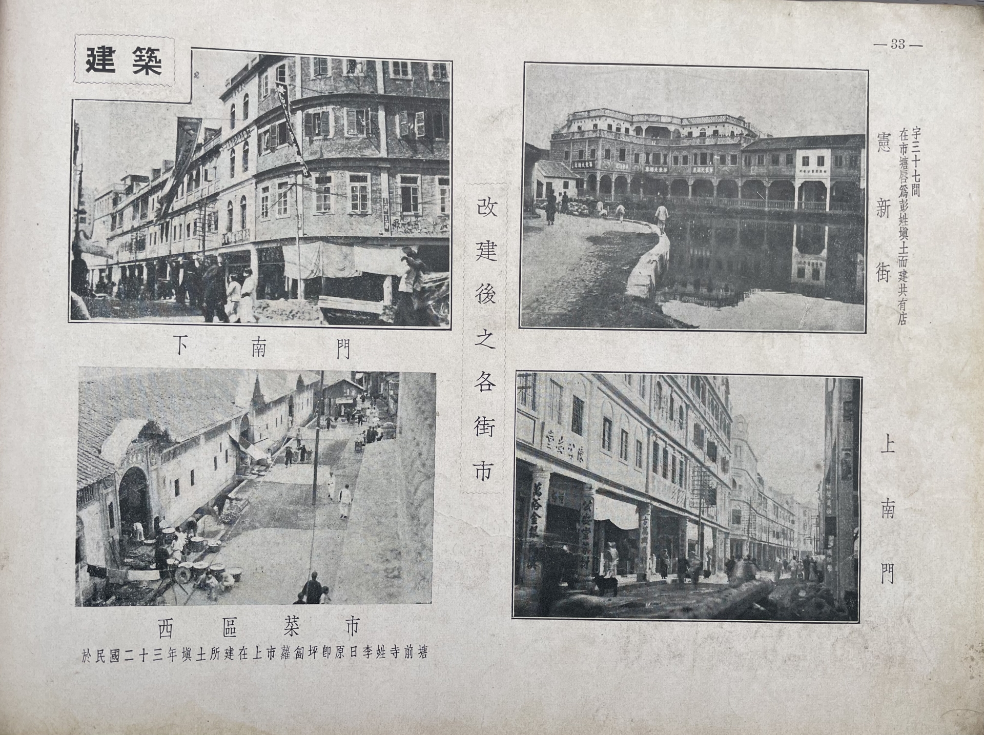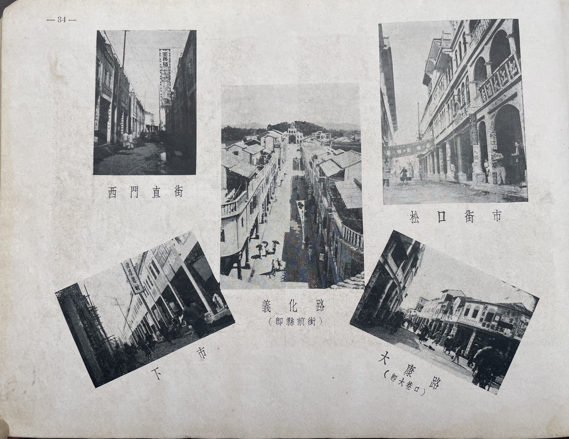 书中“建筑”专栏,刊登了“改建后之各街市”之上南门、下南门、西区菜市(于民国二十三年填土所建,在上市萝匐坪,即原日李姓寺前塘)、宪新街(在市塘唇,为彭姓填土而建,共有店宇三十七间)、西门直街、下市、义化路(即县前街)、大康路(即大巷口)、十字街头、井头街,以及松口街市、畲坑街市,共12幅图片。