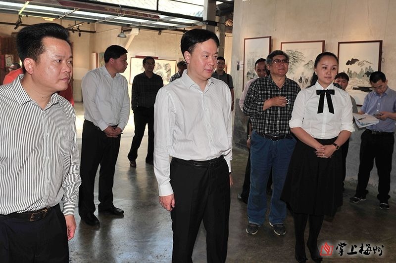 谭君铁在大埔县西河镇北塘村北塘美术馆考察。(钟小丰 摄)
