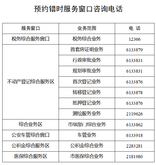 (二)企业和群众预约成功后,可拨打相关窗口咨询电话(详见附件),了解所需办理业务的具体信息。