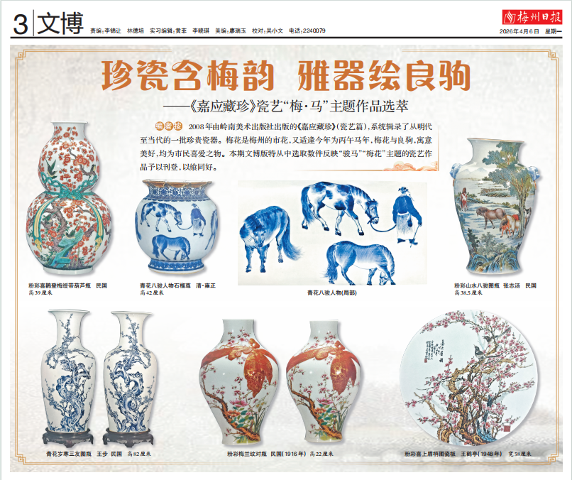 编者按:2008年1月,由收藏家郭横远主编、岭南美术出版社出版的《嘉应藏珍》(瓷艺篇),系统辑录了从明代至当代的一批珍贵瓷器。梅花是梅州市花,今年又恰逢丙午马年,梅花与良驹,寓意美好,均为市民喜爱之物。本期文博版特从中选取数件反映“骏马”“梅花”主题的瓷艺作品予以刊登,以飨同好。