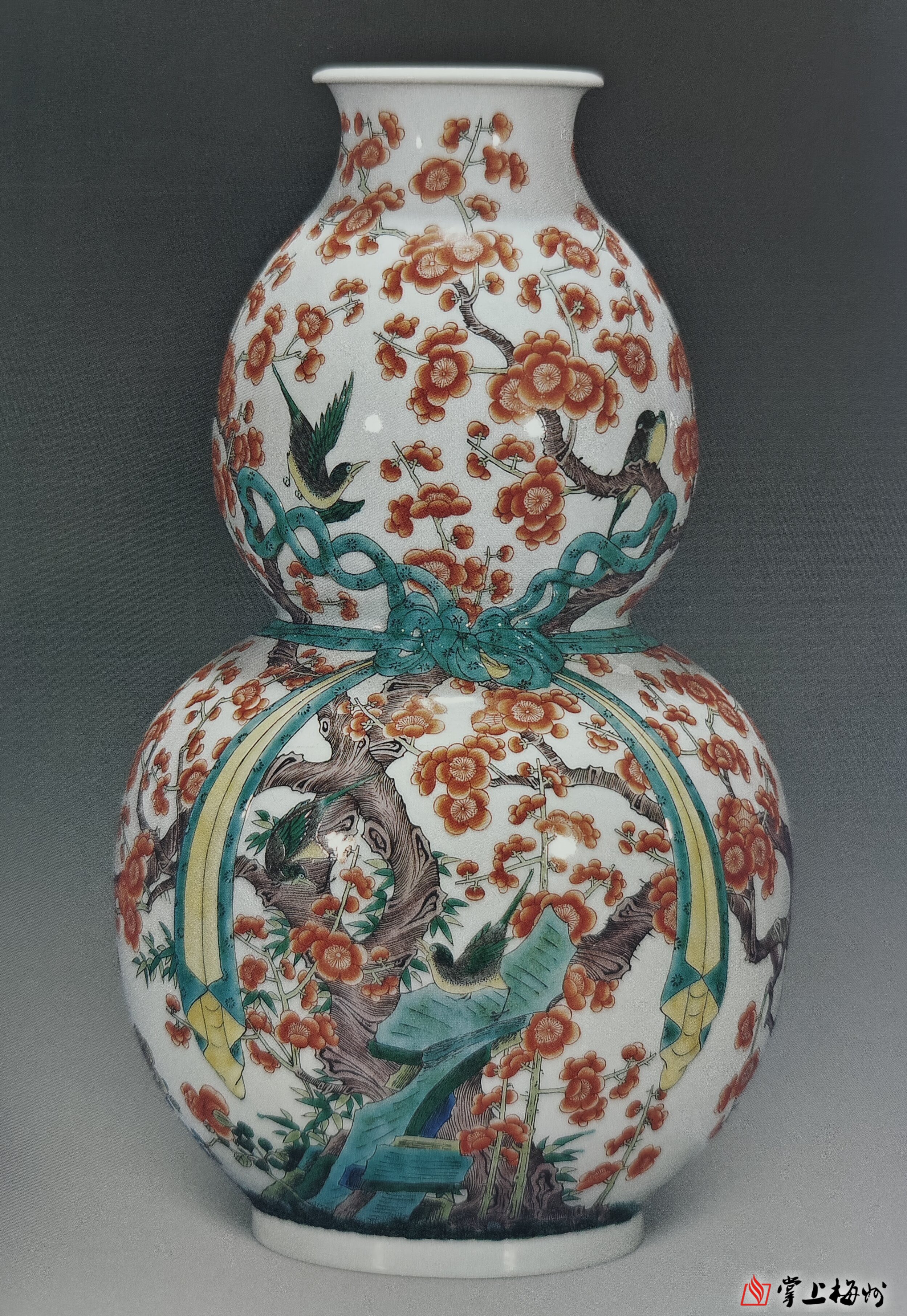 ▲粉彩喜鹊登梅绶带葫芦瓶 民国 高39厘米