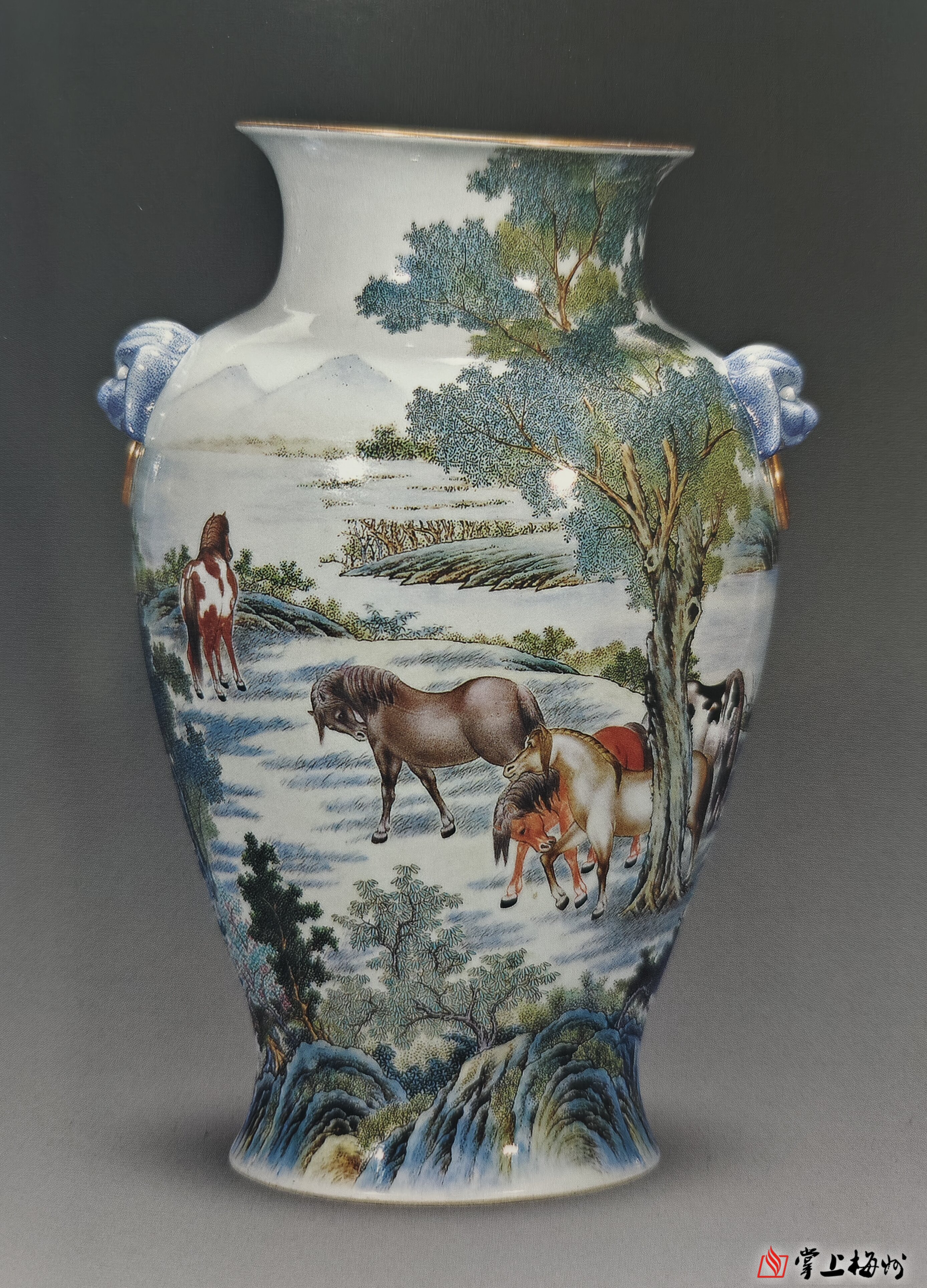 ▲粉彩山水八骏图瓶 张志汤 民国 高38厘米