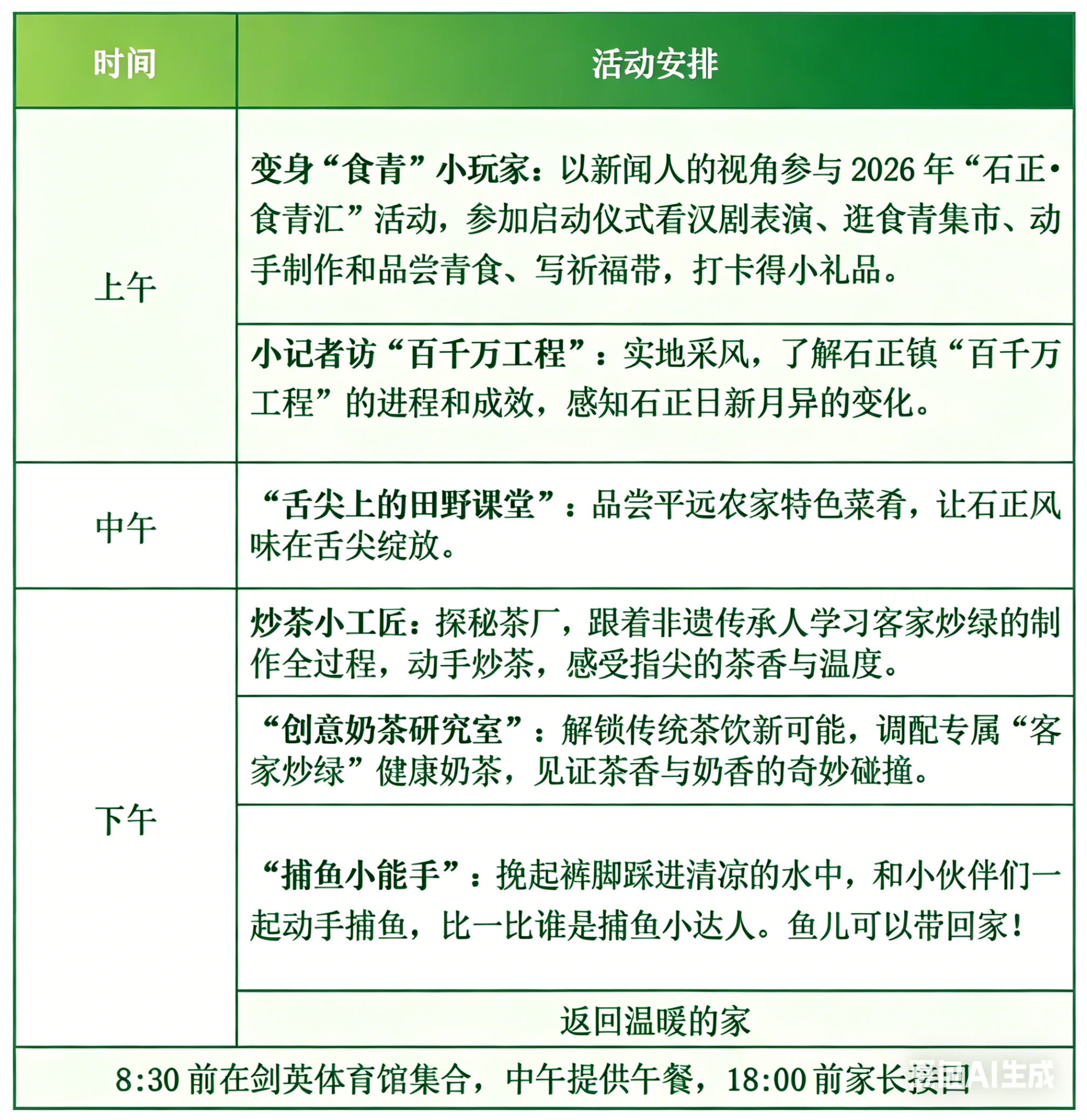 ★变身“食青”小玩家!:逛食青集市,尝一口春天的味道;玩集章打卡,赢茶叶小样和景区优惠券。还能动手做青食、写祈福带,把三月三的快乐写进报纸里!小记者探访摊位、体验非遗、采访摊主与游客,用童眼记录“食青”烟火气,以笔尖传递石正民俗魅力。