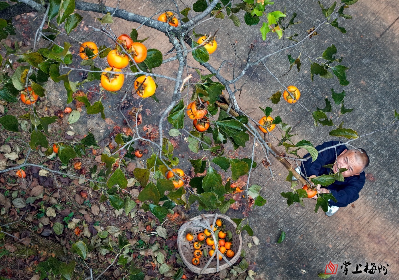树上柿子成熟,村民熟练地用夹子采摘。(高讯 摄)