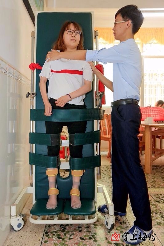 为了促进血液循环,蓝玉娜的弟弟抱她到站立床上进行站立训练。(首席记者 高讯 摄)