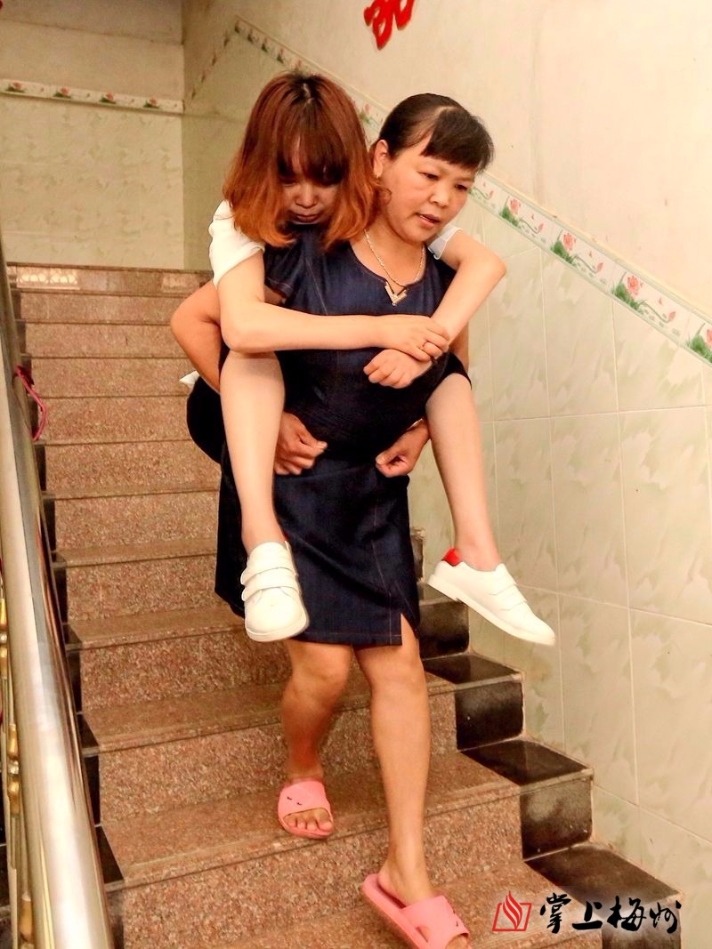 平时出门蓝玉娜都是由家人背着下楼,妈妈说只要她还背得起,就会一直背下去。(首席记者 高讯 摄)