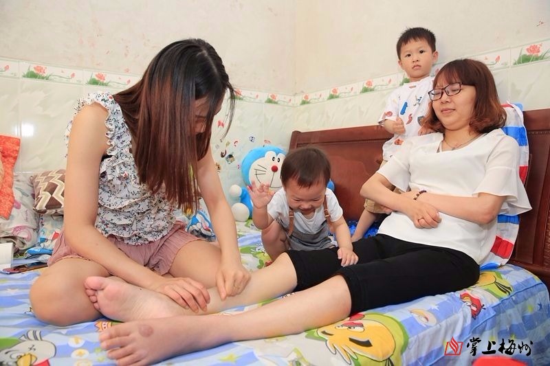 蓝玉娜的妹妹和外甥、外甥女在给蓝玉娜按摩。两个小孩平时和她特别亲,知道她手不方便,有好吃的会先拿给她吃。(首席记者 高讯 摄)