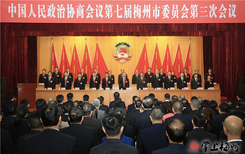 掌上梅州讯 27日上午,市政协七届三次会议在市委礼堂开幕。市政协第七届委员会主席陈建青,副主席叶解春、李忠良、韩小林、周秋明、曾祥海、马志元、陈元星,党组成员张文广、陈志宁、孙秋珍在主席台前排就座。会议由叶解春主持。