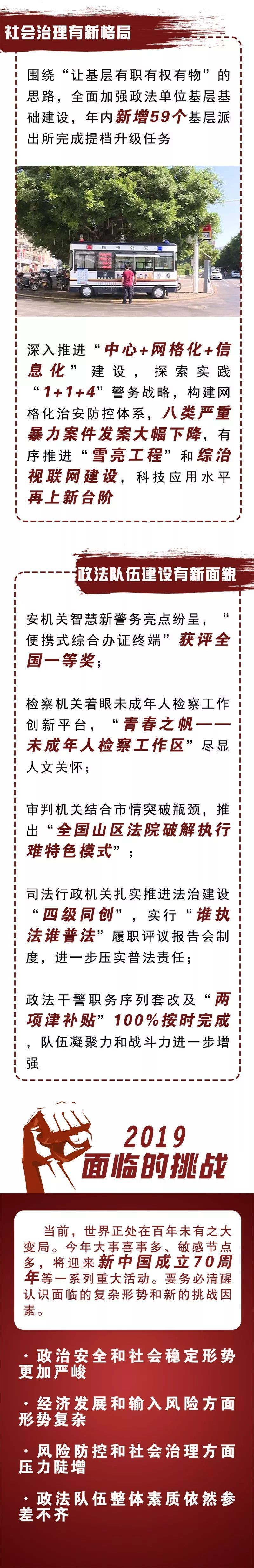 陈敏表示,2019年大事多、喜事多,要深入学习贯彻习近平总书记在中央政法工作会议上的重要讲话精神,以及省委李希书记在省委政法工作会议上的讲话精神,牢牢把握“两个不能变”和“九个必须”,提高政治站位,肩负历史重任,确保一方平安,促进一方发展。全市政法工作要坚持“五个一”,即一个统领,以习近平新时代中国特色社会主义思想为指导,用总书记在中央政法工作会议上的重要讲话精神统领政法各项工作;一个大局,紧紧围绕新中国成立70周年,坚持稳字当头,确保社会大局和谐稳定;一条底线,坚持底线思维,加大防范化解力度,严防重大风险发生;一个品牌,全面建设“平安之乡”,擦亮金字招牌,打造全省最安全稳定、最公平公正、法治环境最好的地区之一;一个方向,毫不动摇坚持党的绝对领导,确保政法工作沿着正确的方向前进。