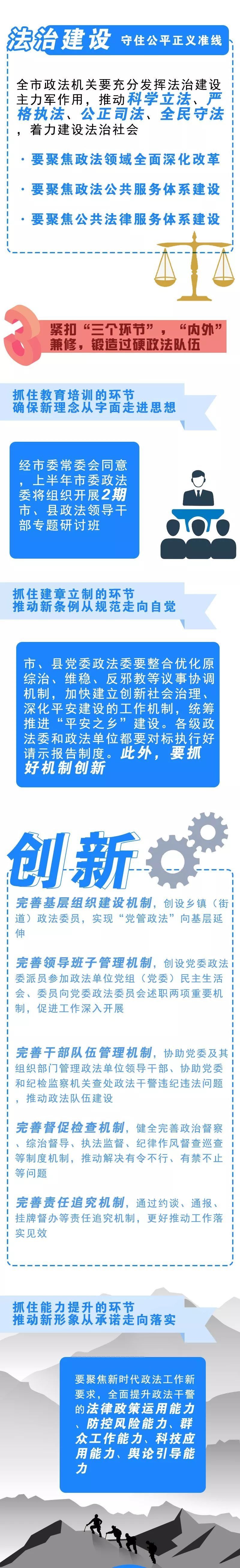 陈敏强调,要强化稳字当头,务实建设“平安之乡”。一是坚决维护国家政治安全,牢固树立总体国家安全观,健全打防管控一体化工作机制,深入实施“三好一正”工程,坚持建设与斗争并重、举旗与亮剑结合、网上与线下统筹。二是全力维护社会稳定,以扫黑除恶专项斗争为龙头,依法打击犯罪活动,化解社会矛盾,集中优势兵力铲除乡村黑恶势力,咬定三年目标,保持凌厉攻势,全力攻克难案、隐案、大案。三是加快推进社会治理现代化,坚持党建引领基层治理,弘扬和发展新时代“枫桥经验”,用“绣花”功夫抓好城市管理,提高智能化、精准化管理水平,坚持依法办事,善用法治思维和法治方式解决社会治理难题,大力推进法治社会建设。四是全面深化政法领域改革,抓好政法机关内设机构改革,深化司法体制综合配套改革,把严格执法放在首位,持续开展“减证便民”行动,推进公共法律服务体系建设,积极引导全民自觉守法、办事依法、遇事找法、解决问题靠法。